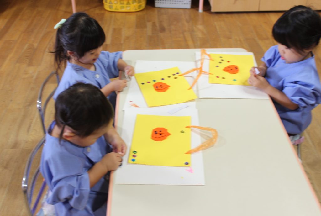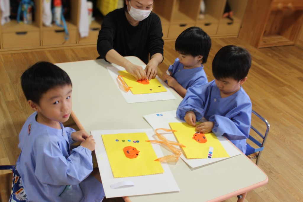 いちご組・ひよこ組では21日にハロウィンパーティーを楽しみました。前日に「ハロウィンのかくれんぼ」という大型絵本を見て、ハロウィンの合言葉『Trick or treat!!』を覚えました。そしてハロウィンバッグも制作しました。シールで飾り付けて出来上がったハロウィンバッグをみんな嬉しそうにお友達と見せ合いっこしていましたよ。