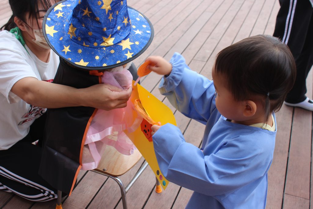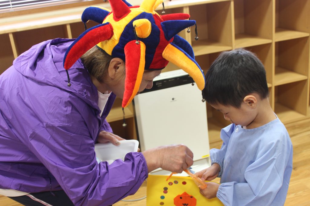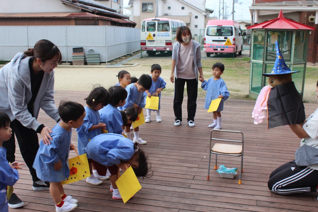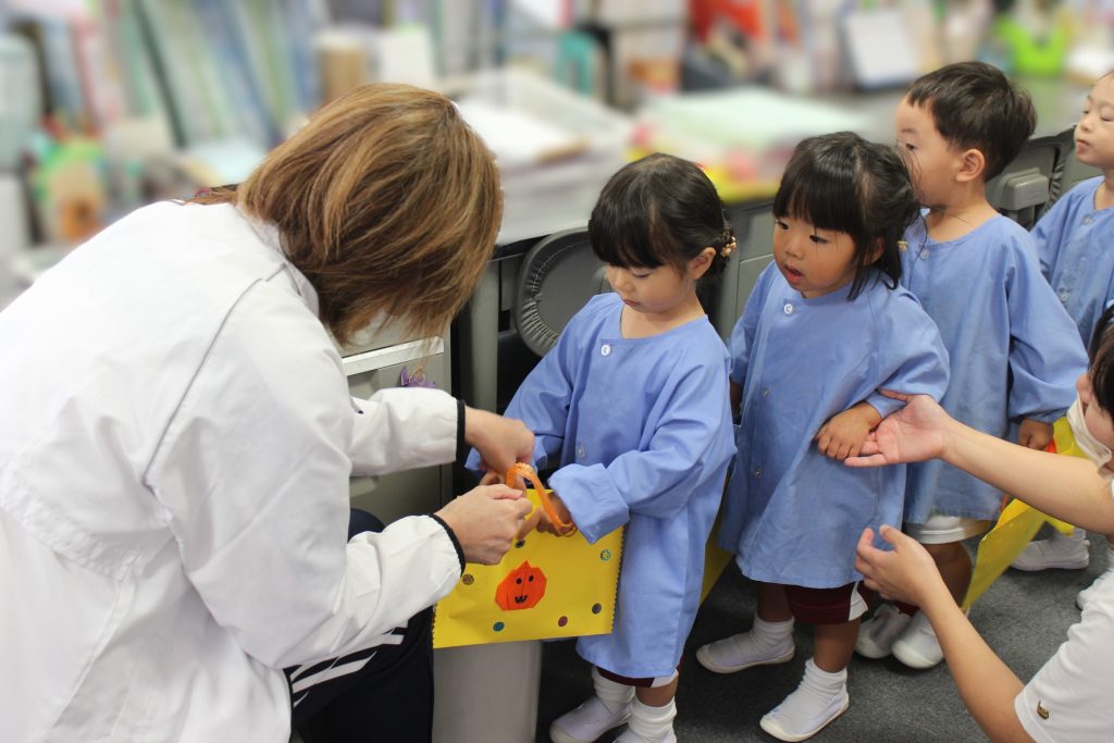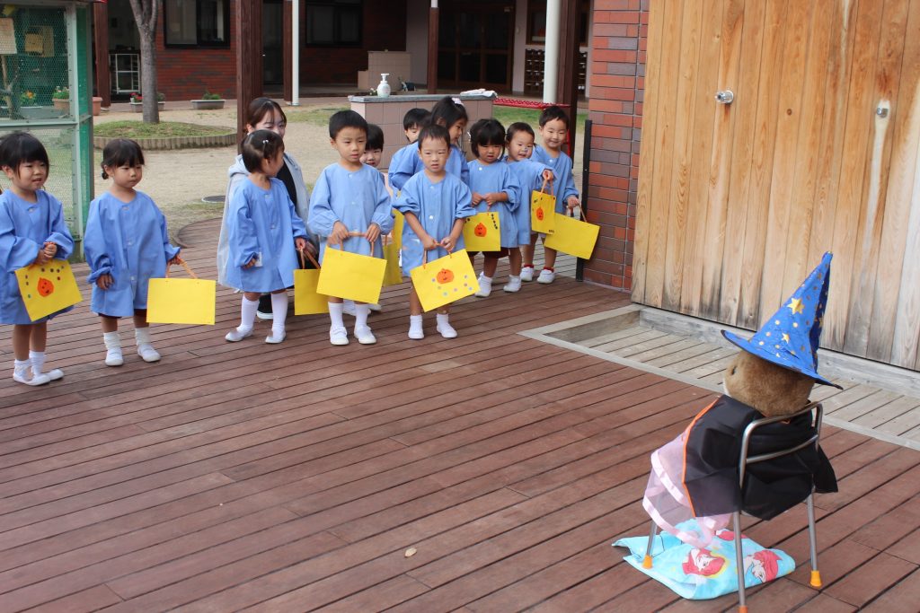 10月に入ってから、子どもたちの会話や遊びの中でハロウィンの話題がよく出てくるようになりました。仮装をして合言葉を言うとお菓子をもらえるということで、おままごとの食べ物をかばんにたくさん詰めて、「はい、お菓子をプレゼント~!」と配って遊ぶ可愛い姿も見られます。