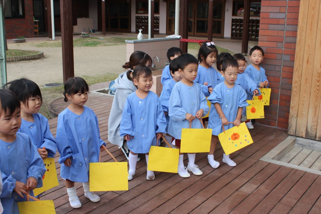 合言葉を覚えて、バッグも持って、準備万端!!ハロウィンパーティーに出発です。幼稚園のどこかにお菓子(折り紙でできています🍩)が隠れている!ということで、みんなで探しに行きました。