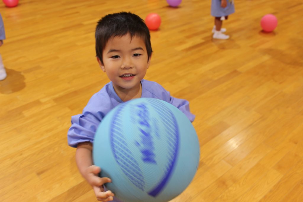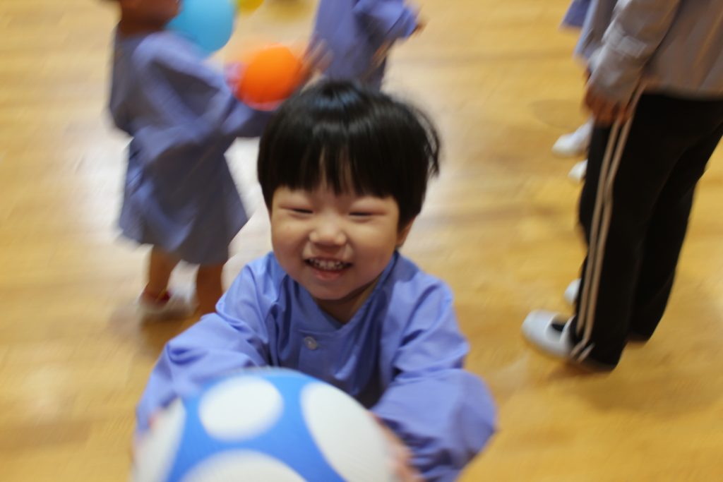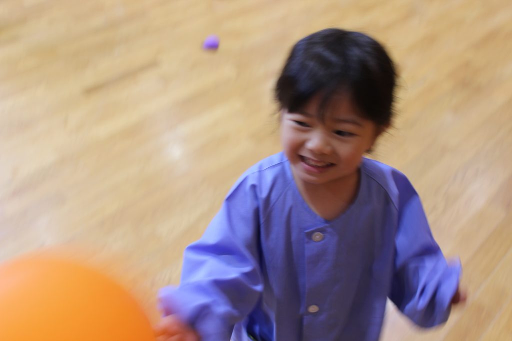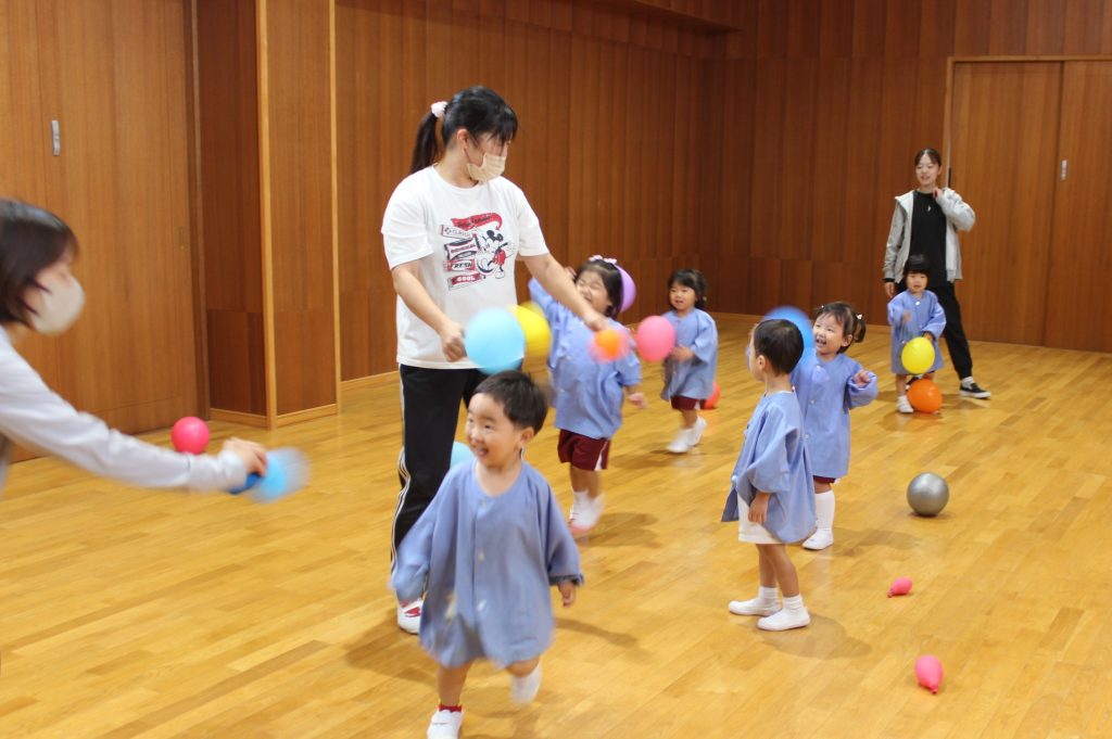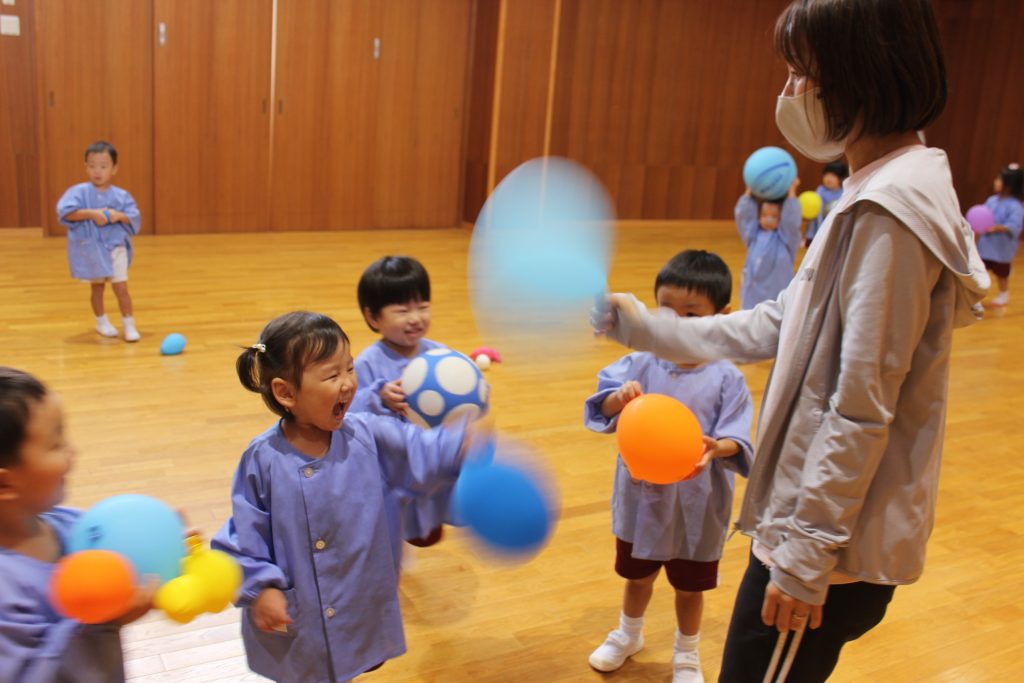 ハロウィンパーティーの後は、ホールで風船やボールで遊びました!「先生、いくよ~!!」とボールを投げ合ったり、追いかけっこをしたりと、楽しいひとときを過ごしました。