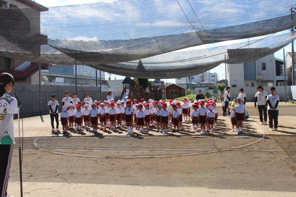 だんだんと運動会の日が近づいてきて、毎日ダンスやかけっこのお稽古を頑張っているいちご組・ひよこ組の子どもたち。最初は列に並んで歩くことも難しかったところからのスタートでしたが、前のお友達を見てかっこよく行進が出来る様になりました。  「ポップコーン」という曲に合わせて、園庭中央の円の中でダンスをします。まるでポップコーンがはじけるように元気いっぱいジャンプ!ジャンプ!  途中で何度か、可愛いお顔のポーズが出てきます。みんな「にこっ♡」と素敵な笑顔を見せてくれますのでお楽しみにしてくださいね。当日は、ポップコーン屋さんの衣装を着て、手作りサンバイザーをかぶります。 保育室では遊びの時間にも赤いサンバイザーをかぶって、ポップコーン屋さんごっこが始まります。「いらっしゃいませ~!」「キャラメル味をください!」と会話のやり取りをしたり、おもちゃのクリップをお金に見立ててお買い物をしたりして楽しんでいます。  運動会当日は、元気いっぱい!笑顔いっぱい!のダンスを見せてくれるのを楽しみにしています。