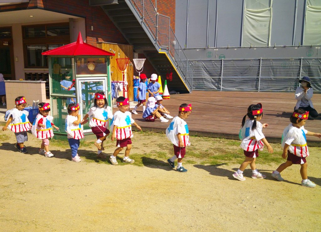だんだんと運動会の日が近づいてきて、毎日ダンスやかけっこのお稽古を頑張っているいちご組・ひよこ組の子どもたち。最初は列に並んで歩くことも難しかったところからのスタートでしたが、前のお友達を見てかっこよく行進が出来る様になりました。  「ポップコーン」という曲に合わせて、園庭中央の円の中でダンスをします。まるでポップコーンがはじけるように元気いっぱいジャンプ!ジャンプ!  途中で何度か、可愛いお顔のポーズが出てきます。みんな「にこっ♡」と素敵な笑顔を見せてくれますのでお楽しみにしてくださいね。当日は、ポップコーン屋さんの衣装を着て、手作りサンバイザーをかぶります。 保育室では遊びの時間にも赤いサンバイザーをかぶって、ポップコーン屋さんごっこが始まります。「いらっしゃいませ~!」「キャラメル味をください!」と会話のやり取りをしたり、おもちゃのクリップをお金に見立ててお買い物をしたりして楽しんでいます。  運動会当日は、元気いっぱい!笑顔いっぱい!のダンスを見せてくれるのを楽しみにしています。