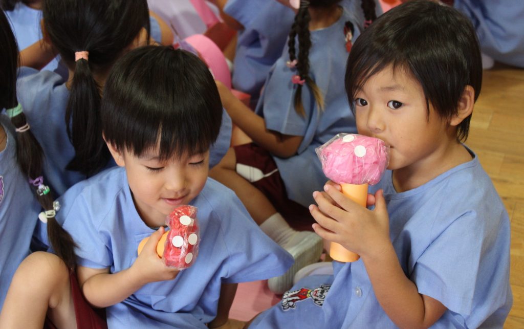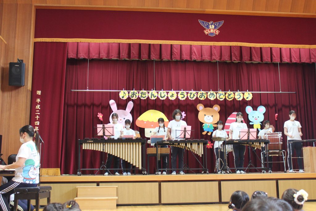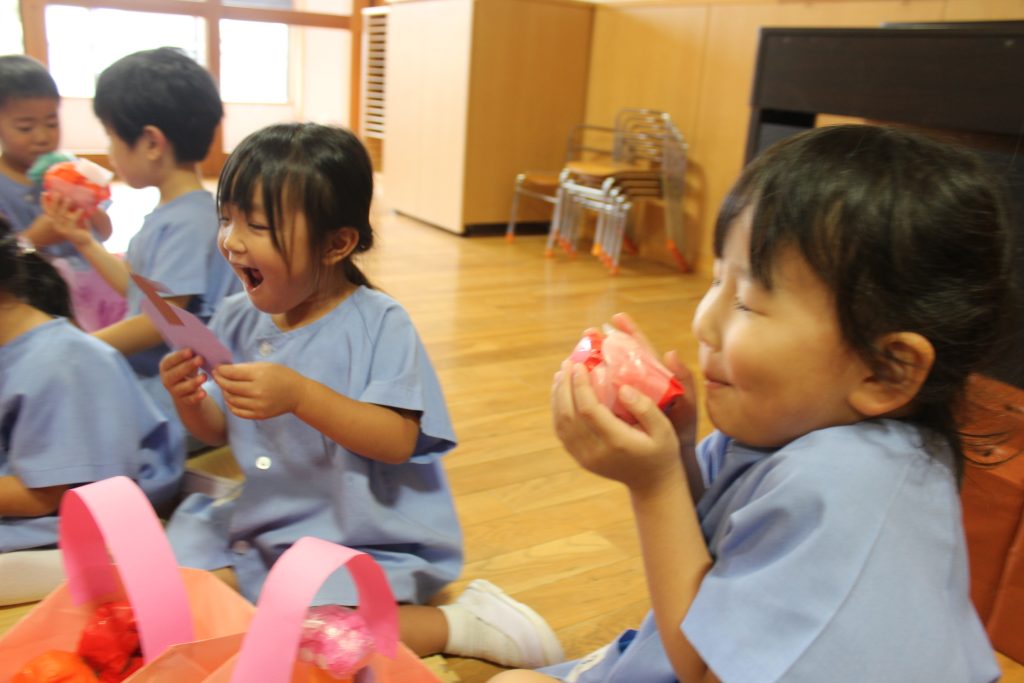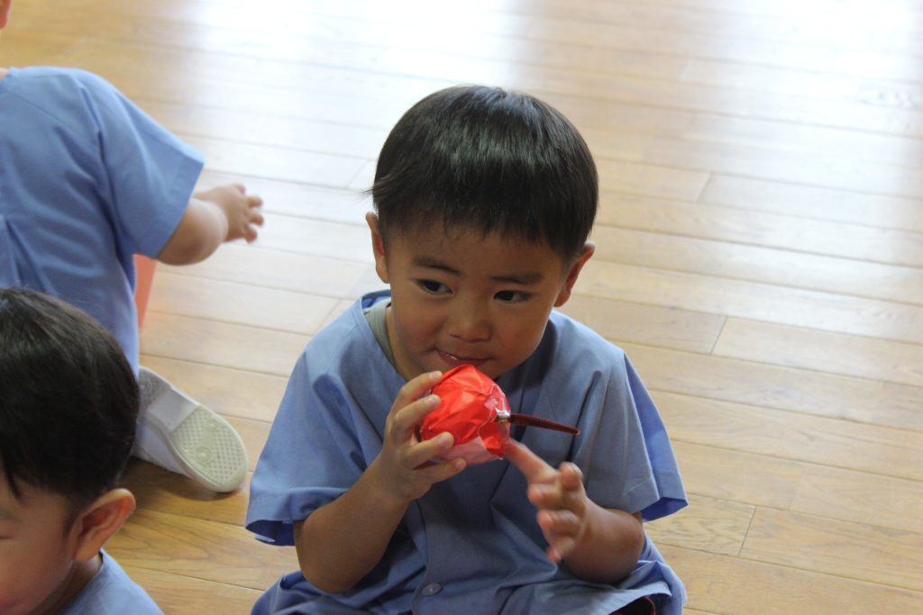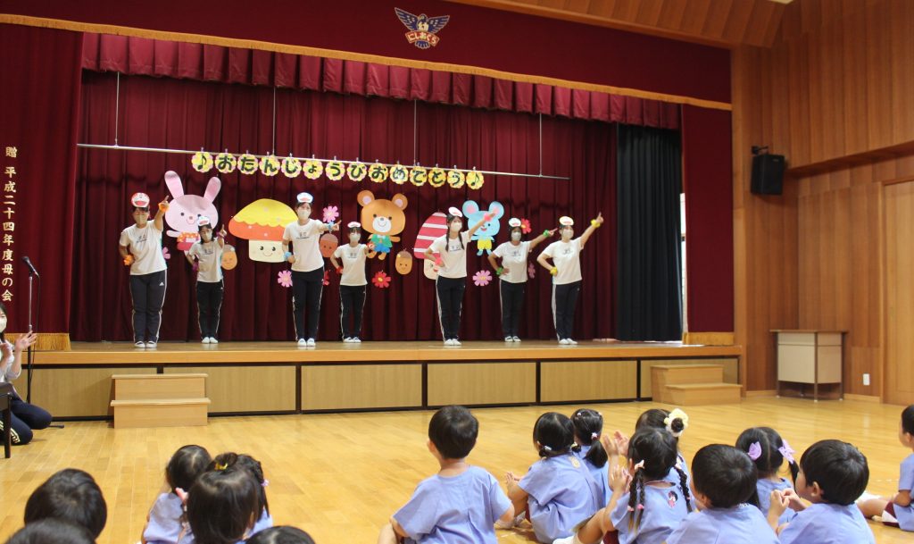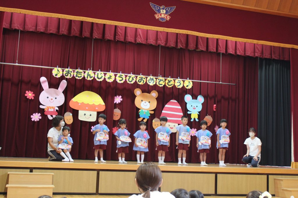 舞台に並ぶと、少しドキドキしながらも、クラスとお名前、何歳になったかを発表してくれました。お祝いをするみんなの瞳もキラキラ輝いていて、一つ大きくなる事への憧れや、お誕生日を楽しみにしている様子が感じられました。