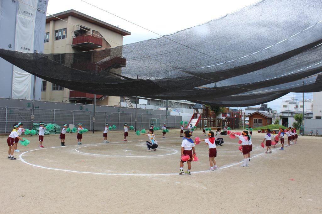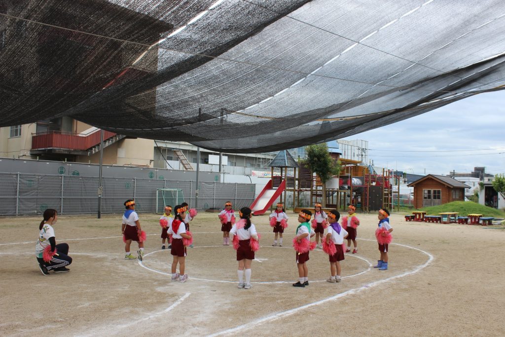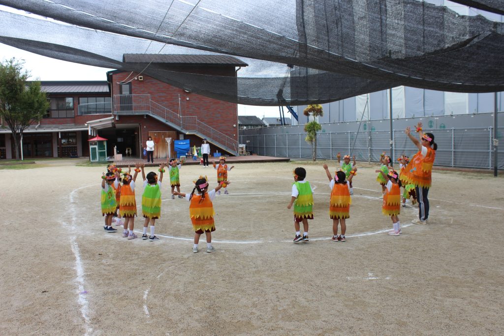 ①はと組は本部側、つばめ組は遊具側に円になって踊ります。始めは内側を向いて、途中で外側を向いて踊ります。