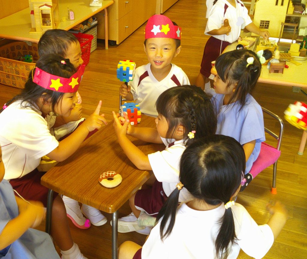 保育室では遊びの時間にも赤いサンバイザーをかぶって、ポップコーン屋さんごっこが始まります。「いらっしゃいませ~!」「キャラメル味をください!」と会話のやり取りをしたり、おもちゃのクリップをお金に見立ててお買い物をしたりして楽しんでいます。