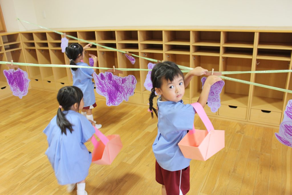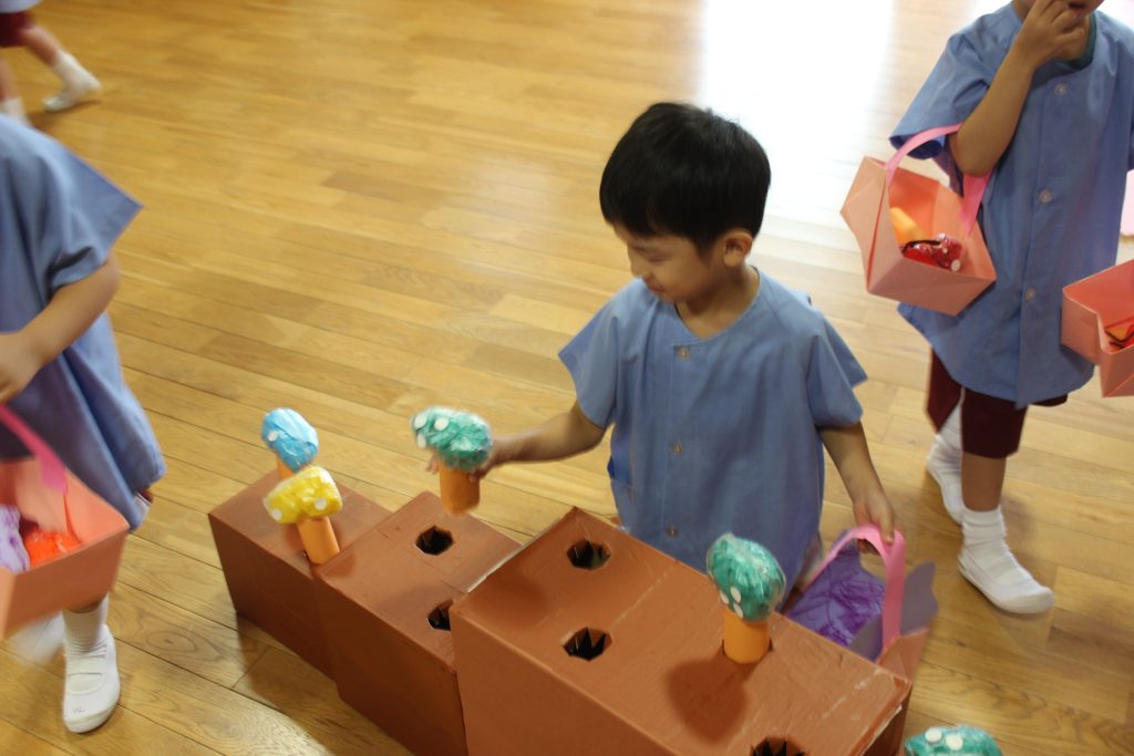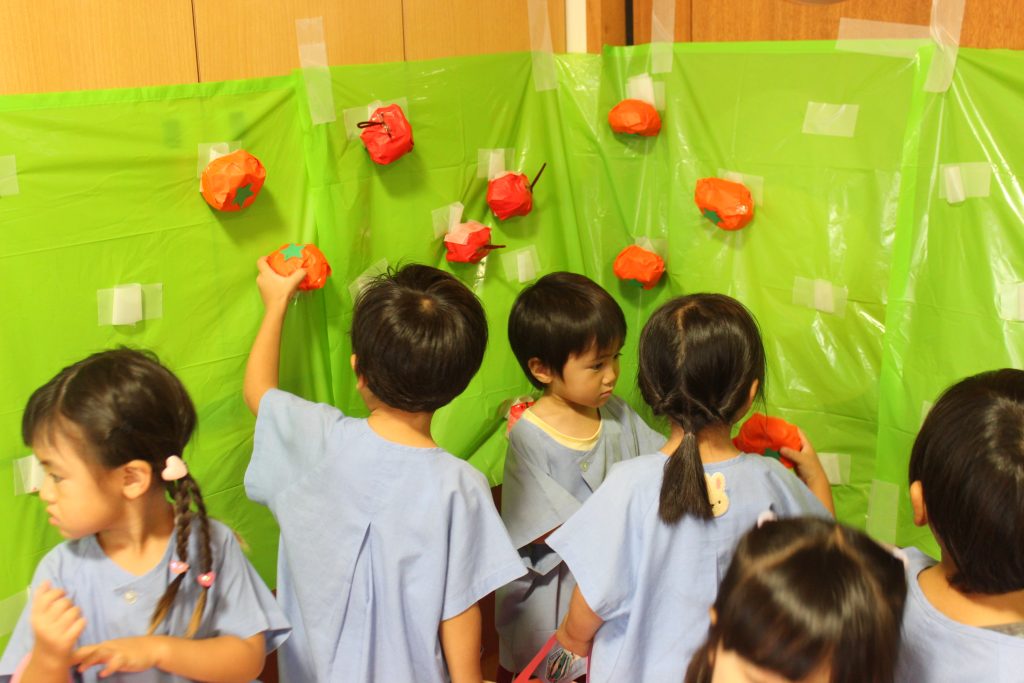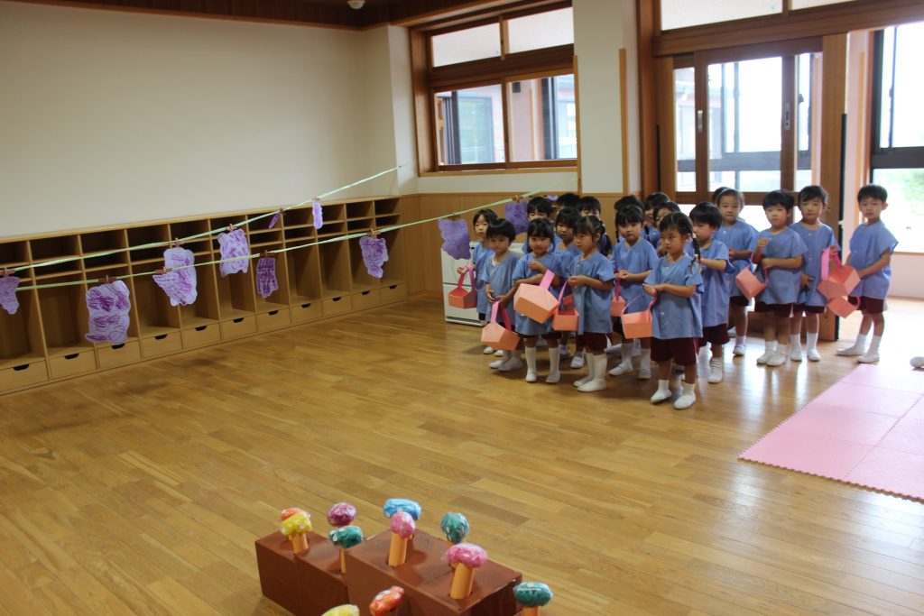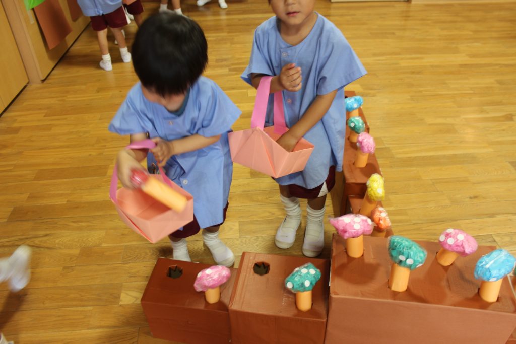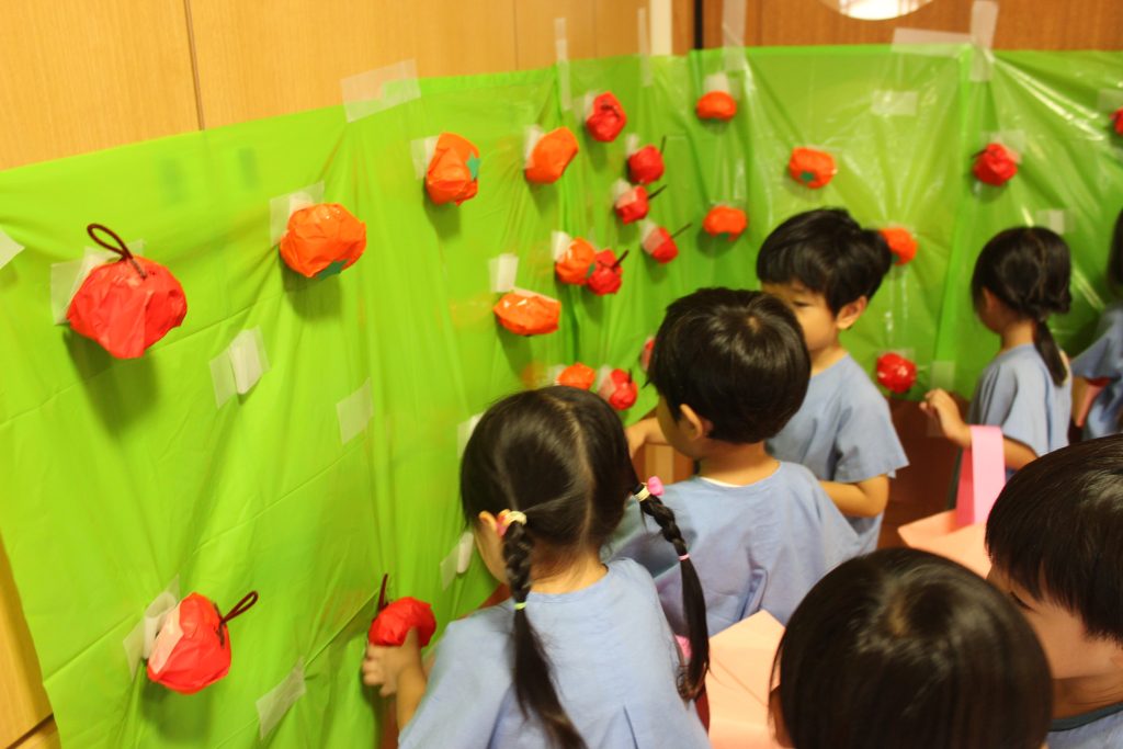 お部屋に入ると、たくさんの食べ物が飾ってあり「うわー!」「きのこや!ぶどうや!」などと、目をキラキラさせてワクワクしてきた子どもたち✨