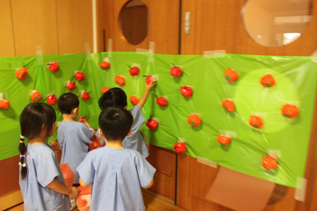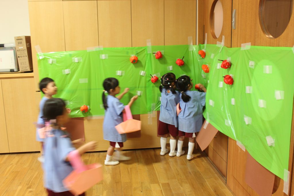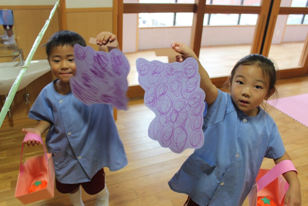 先週に「りんご」「かき」「きのこ」「ぶどう」を制作し、今日は、楽しみにしていた秋の食べ物狩りをしました!