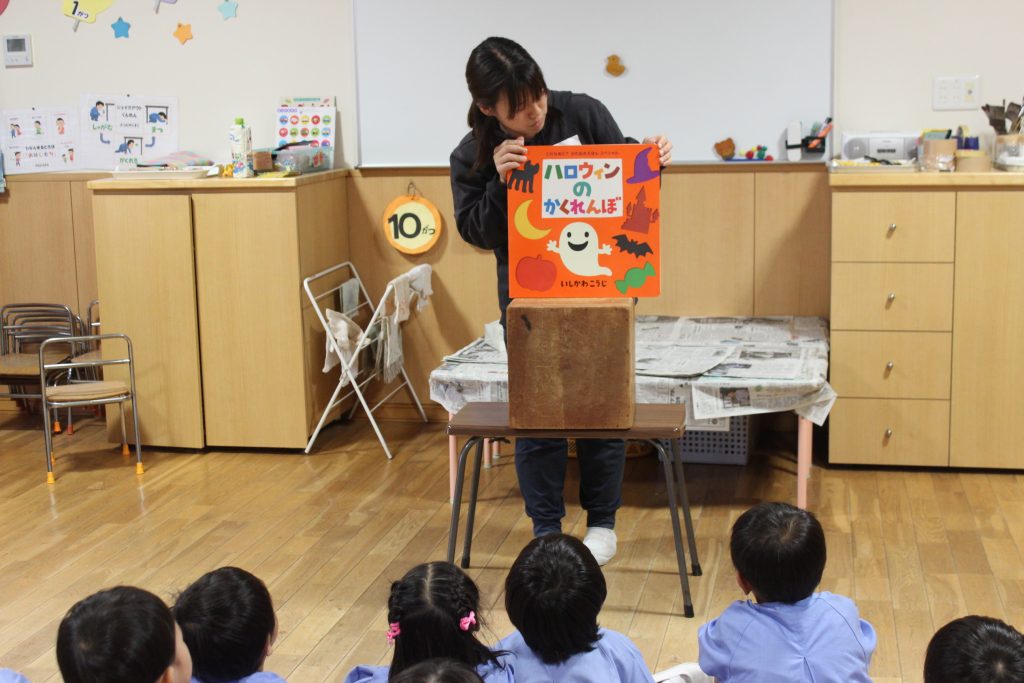 大型絵本を読んだ後は、作ったカボチャのお面とおばけのバッグを身に着けてハロウィンパーティーの始まりです🎃