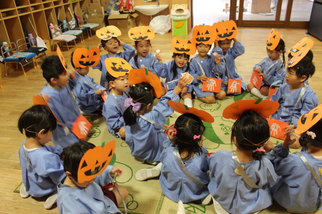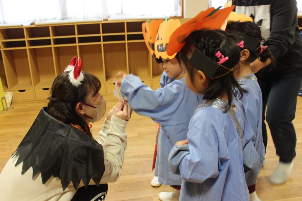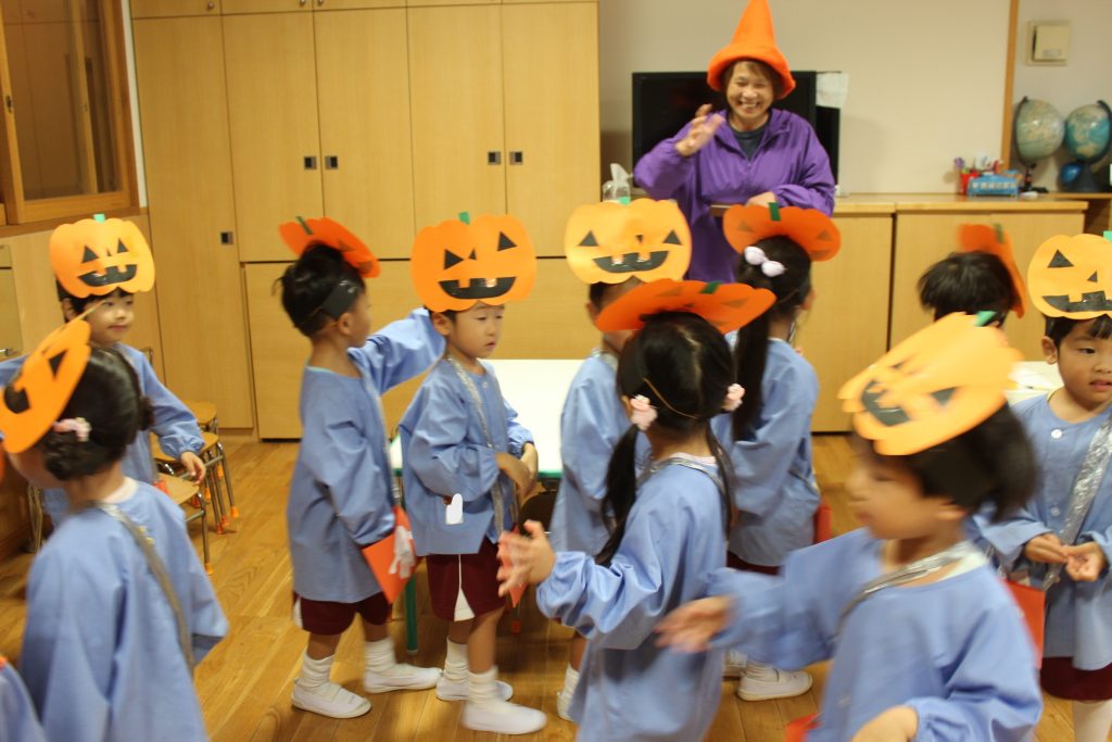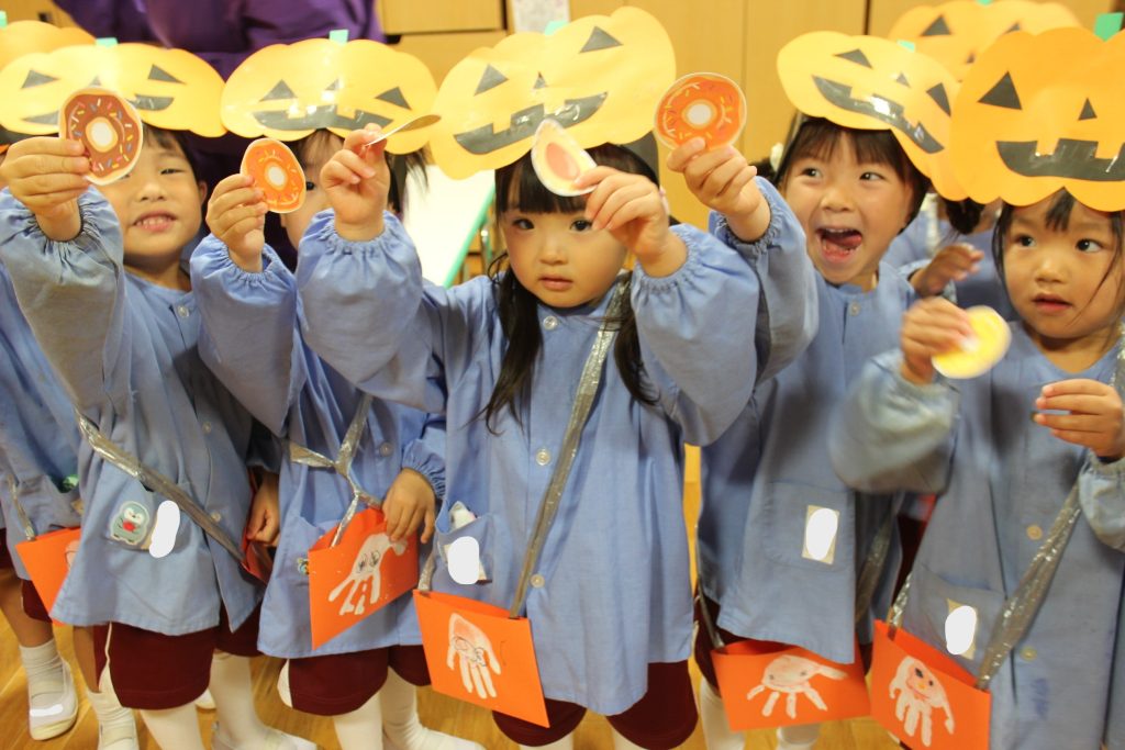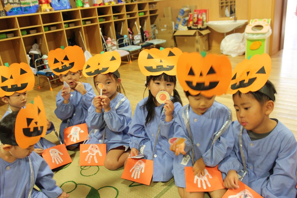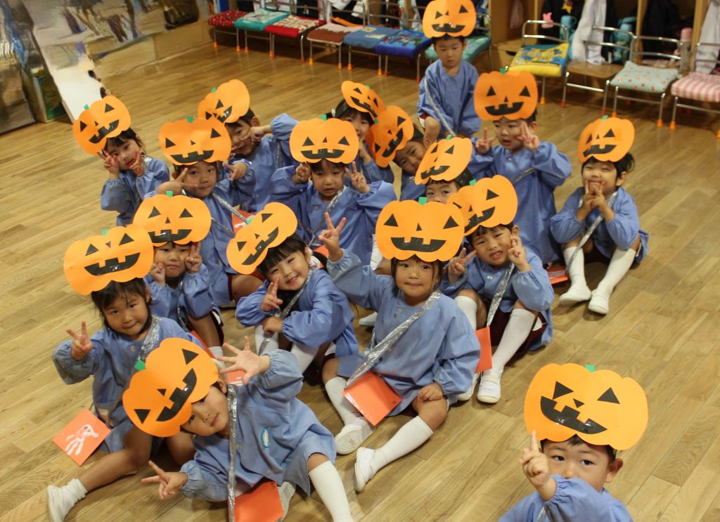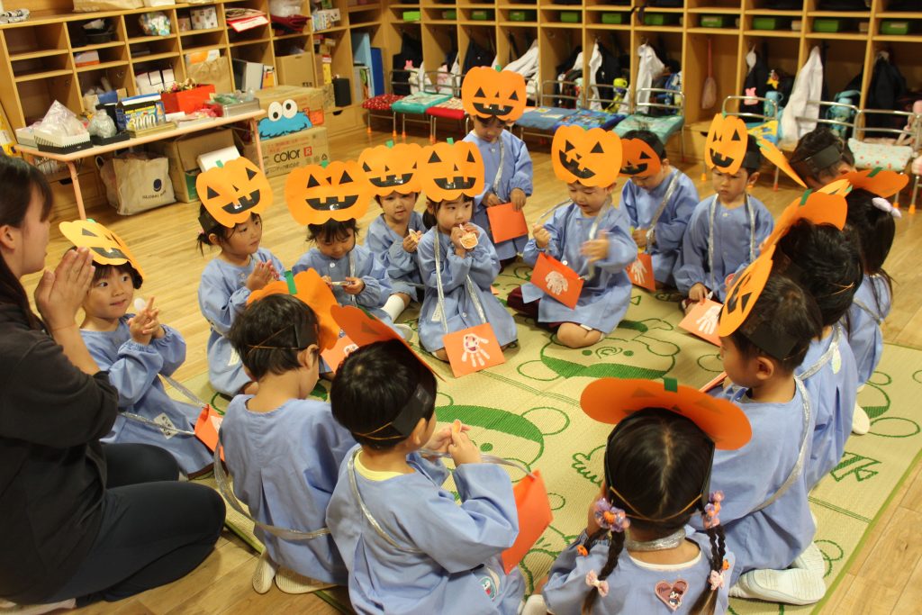先週にカボチャのお面を制作し、作った日からハロウィンパーティーを楽しみにしていた子どもたち。「今日はハロウィンパーティー!」「お菓子もらえるん!?」「いつするんー?」とワクワクしながら登園してきてくれました!