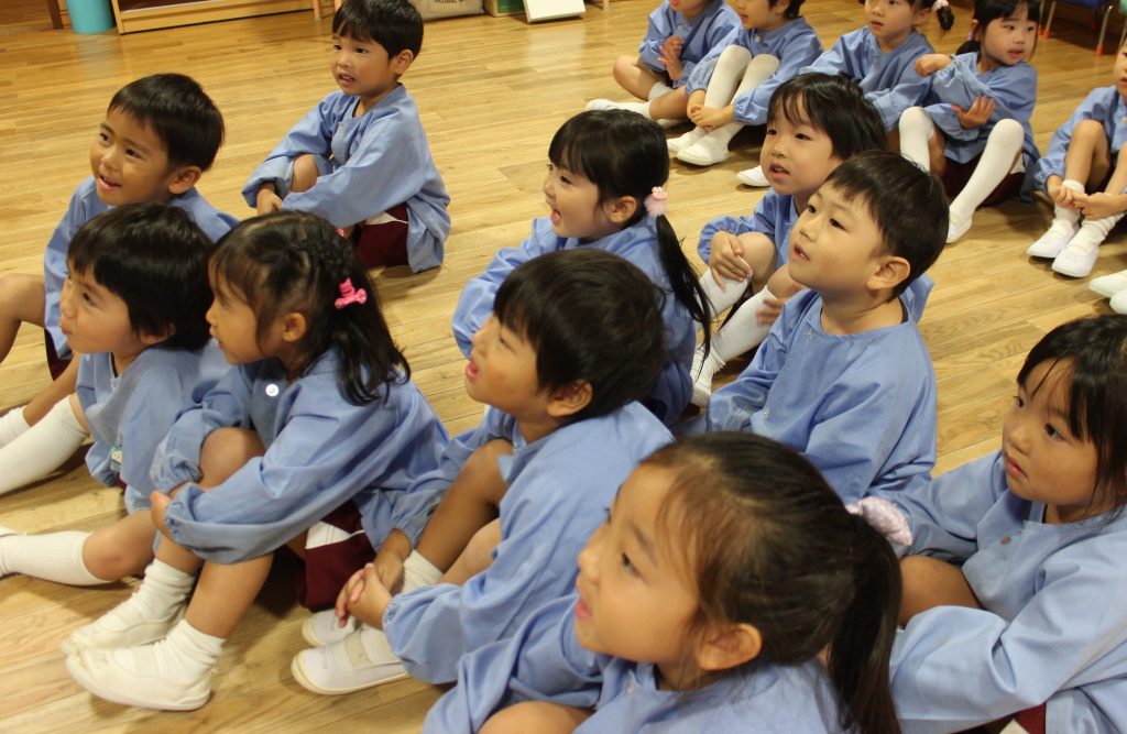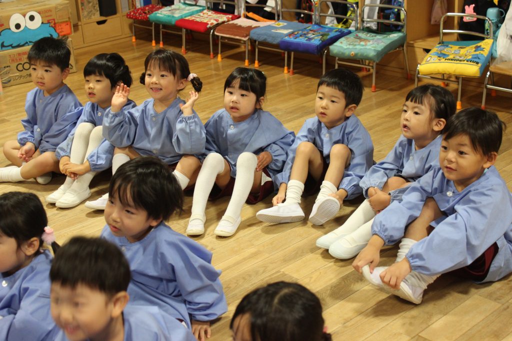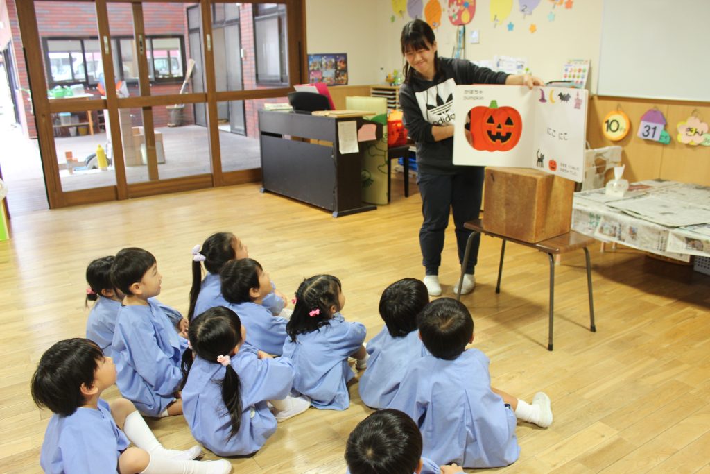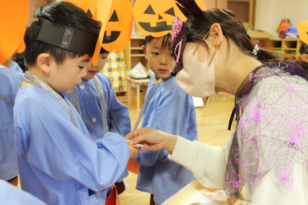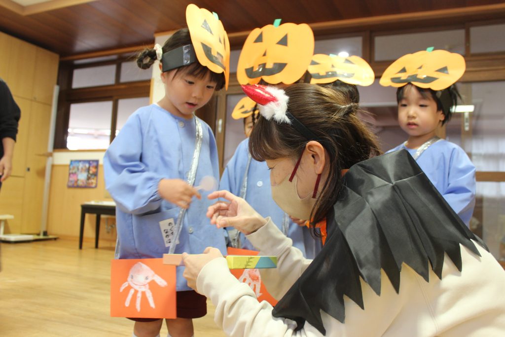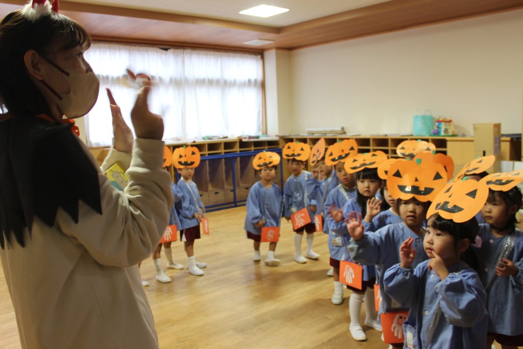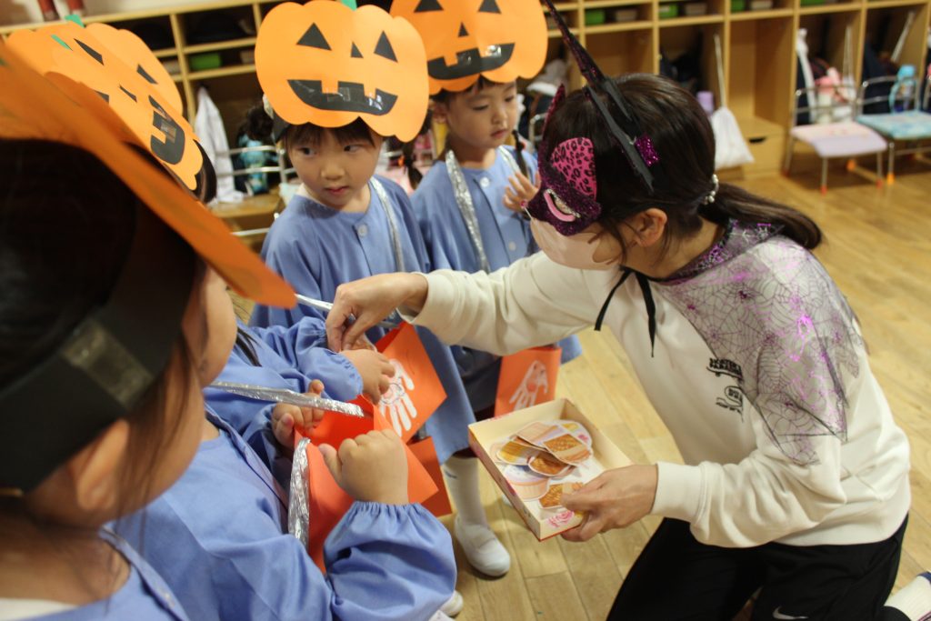 先週にカボチャのお面を制作し、作った日からハロウィンパーティーを楽しみにしていた子どもたち。「今日はハロウィンパーティー!」「お菓子もらえるん!?」「いつするんー?」とワクワクしながら登園してきてくれました!