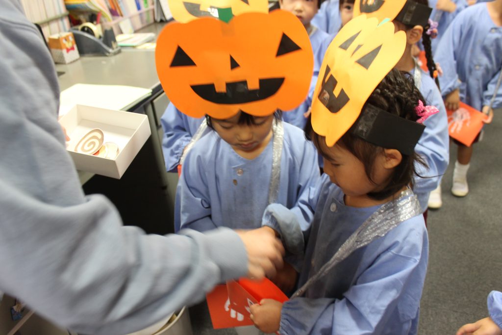 始めは、職員室へ!みんなで「トリックオアトリート」と言って1つ目のお菓子をもらいしました!