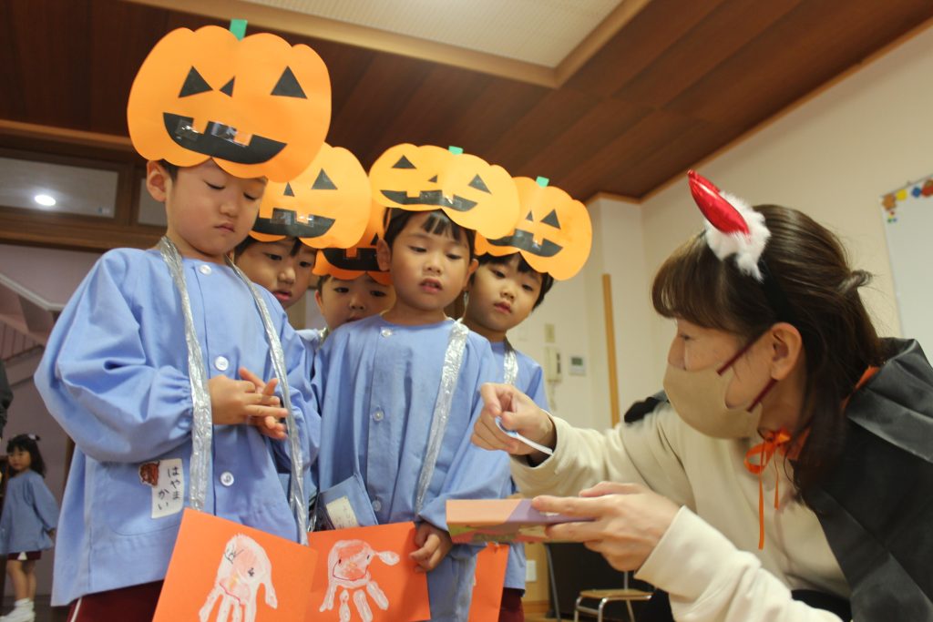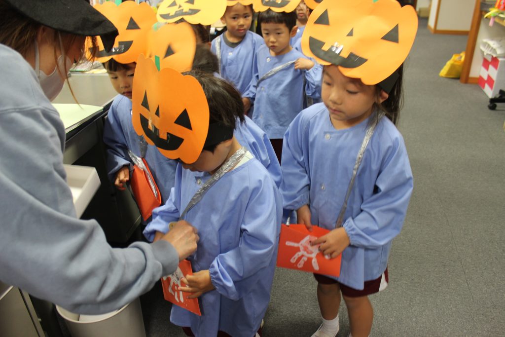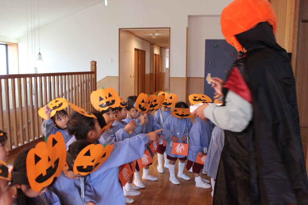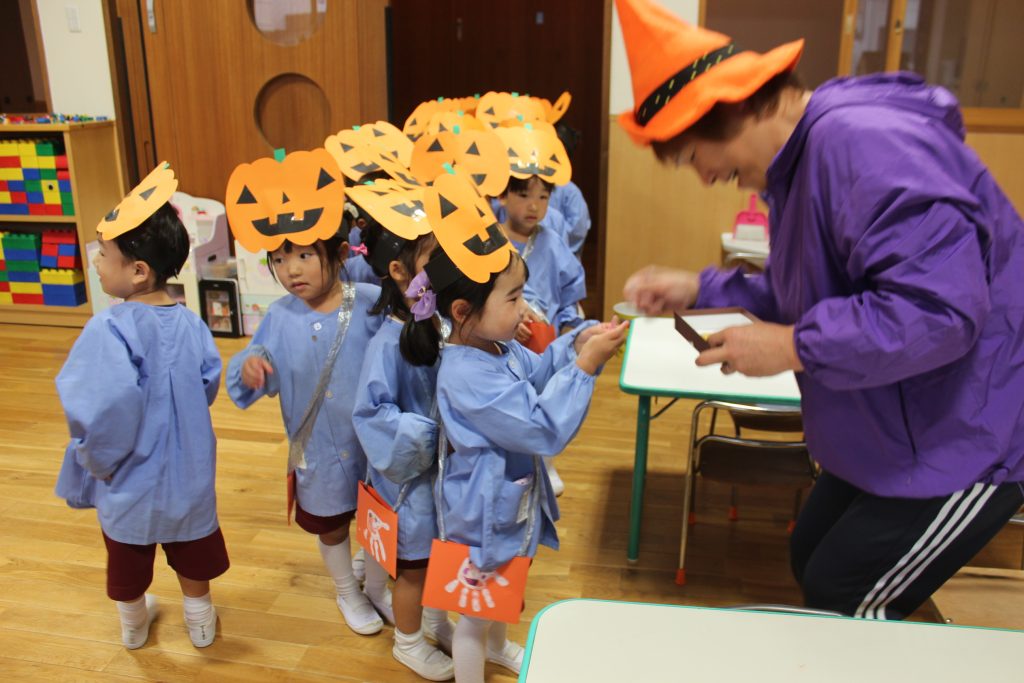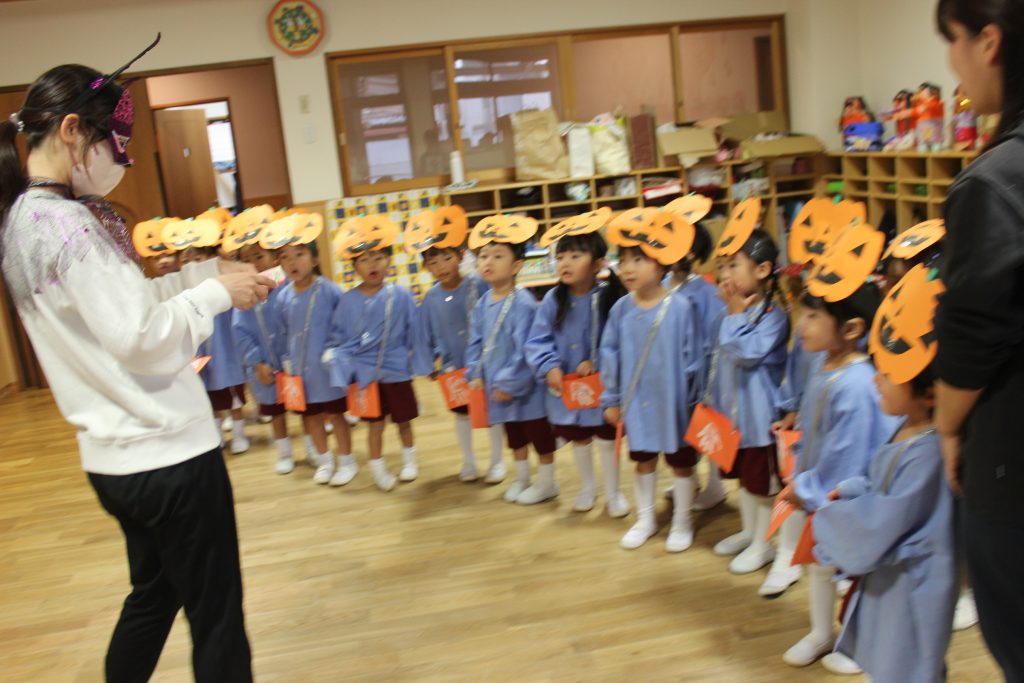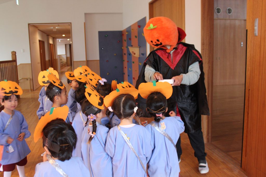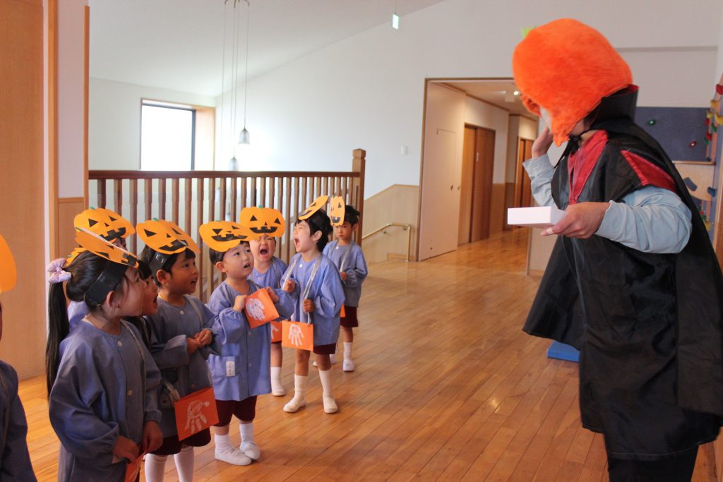 最後は、ホールに向かうとカボチャさんが登場!!元気いっぱいに「トリックオアトリート!!」と言うと5つ目のお菓子をもらい大喜びの子どもたちでした!