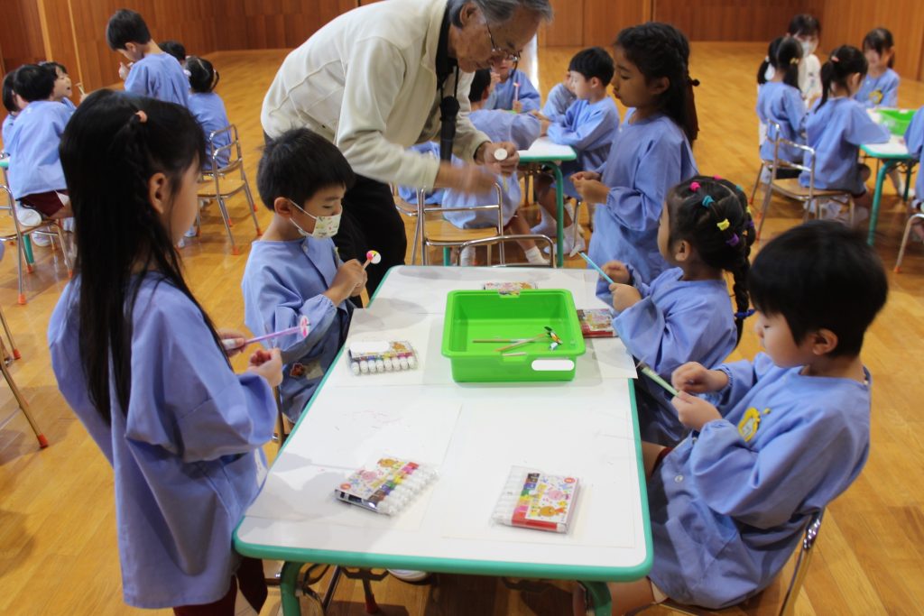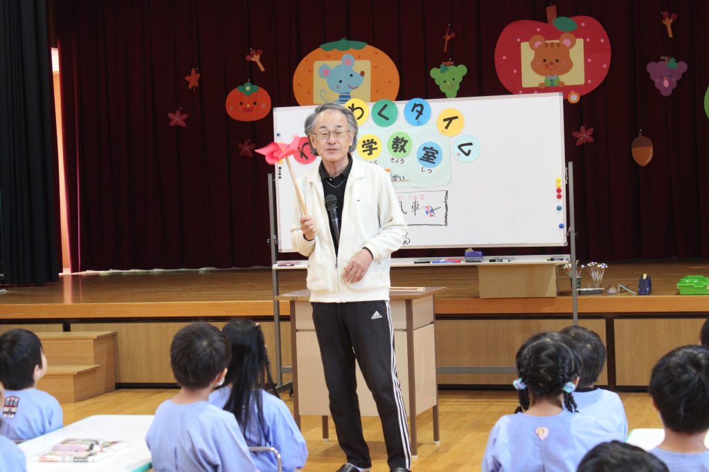 理事長先生が風車のついた棒をこするとクルクルと回り出す様子を見て、不思議そうにしていた子どもたち。