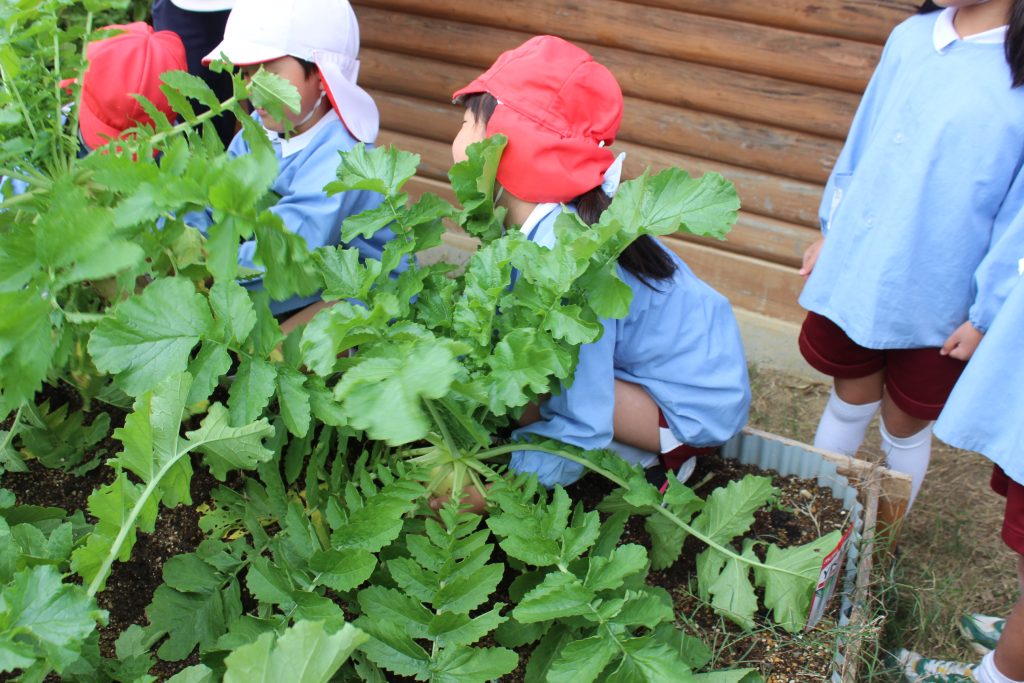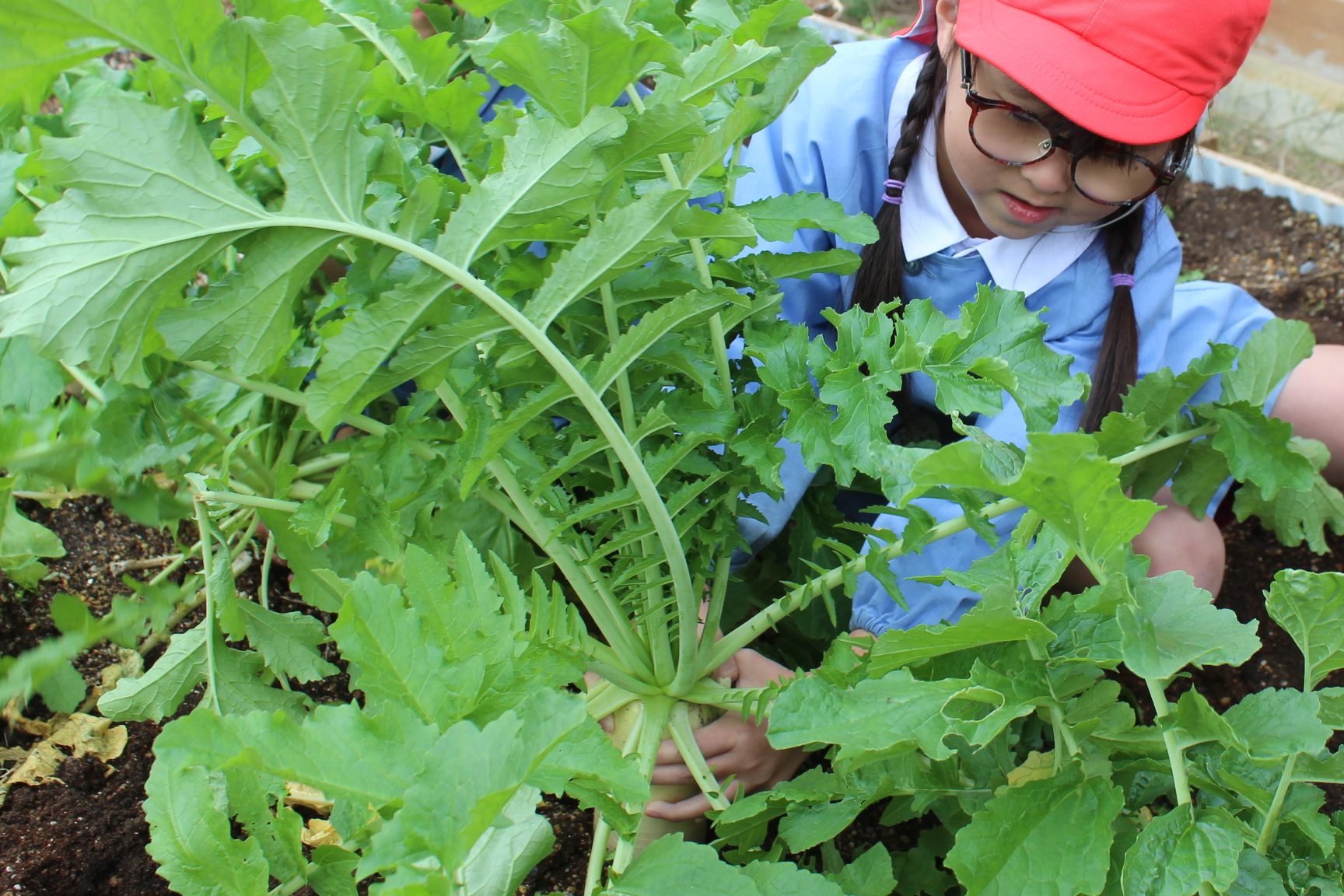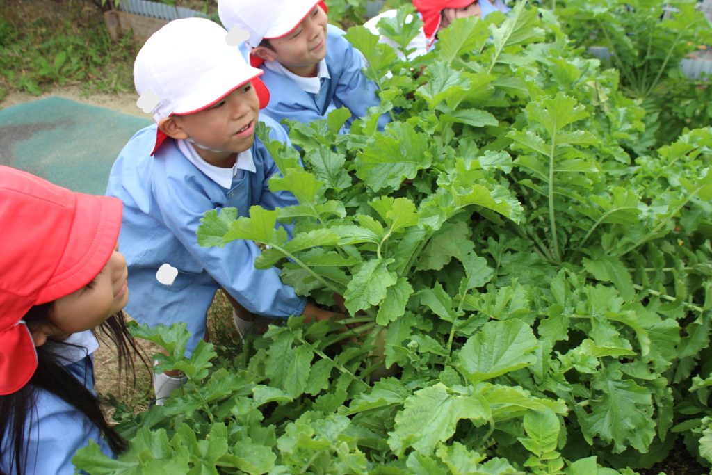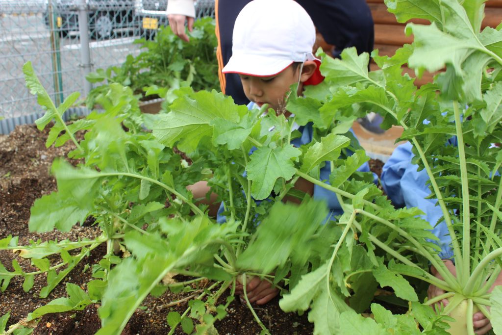 「大根の葉っぱすごい大きくなってるー!」「白いのが見えてるよ」