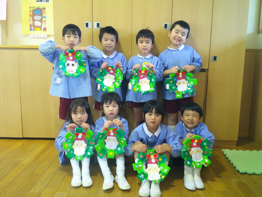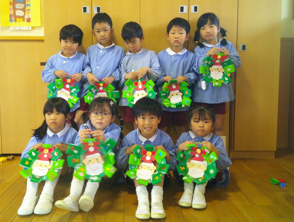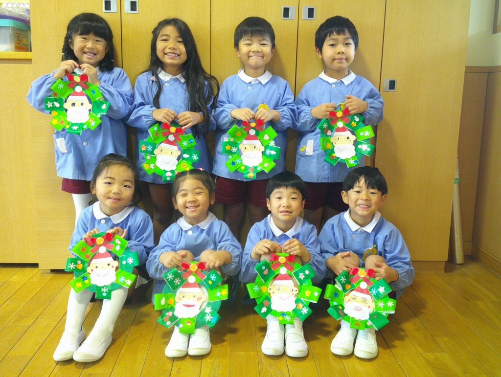 自分で顔を描いたサンタさんを真ん中に貼り、周りには雪だるま、ハート、星など、たくさんの飾りを飾りました。