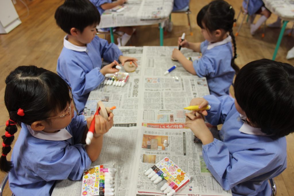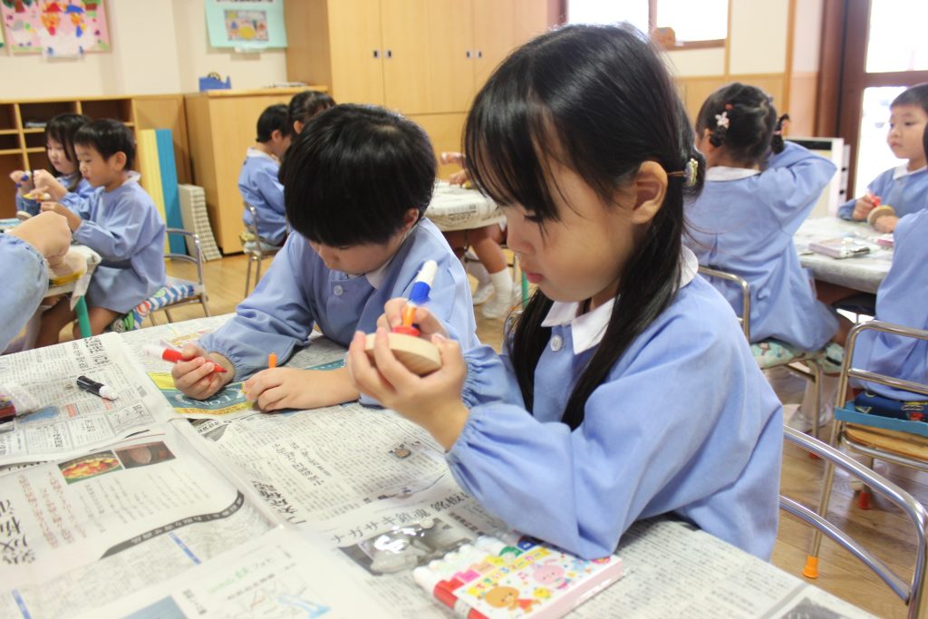 先日、年中組ではお正月遊びの一つとして、こま制作を行いました。