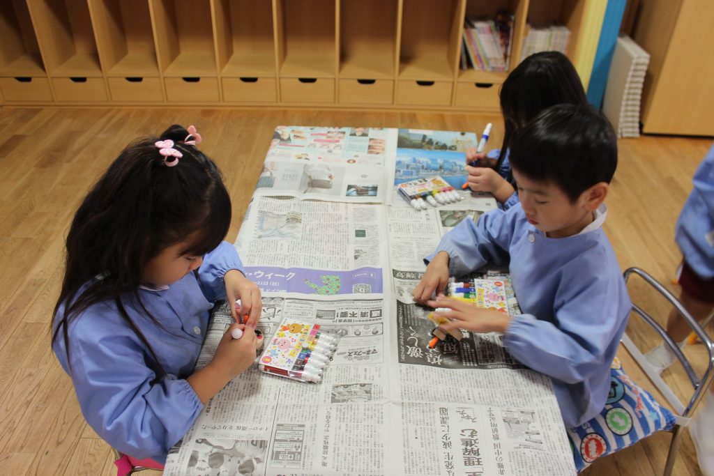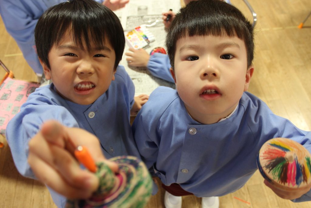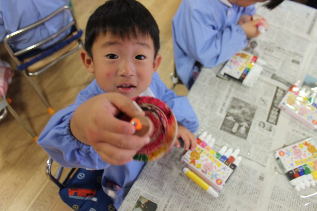 始めに、お正月遊びにはどんな物があるのかを話し合いました。凧揚げ・かるた・羽根つきなど様々な遊びが口々に出てきました。その後、今日作るこまの紹介をし、紐を使って回してみると「すごーい!」「めっちゃ回ってる!!」と興味津々の子どもたち。自分のこまをもらい、色を塗ったり好きな模様を描いたりして世界に一つだけのとっても素敵なこまが出来上がりました✨