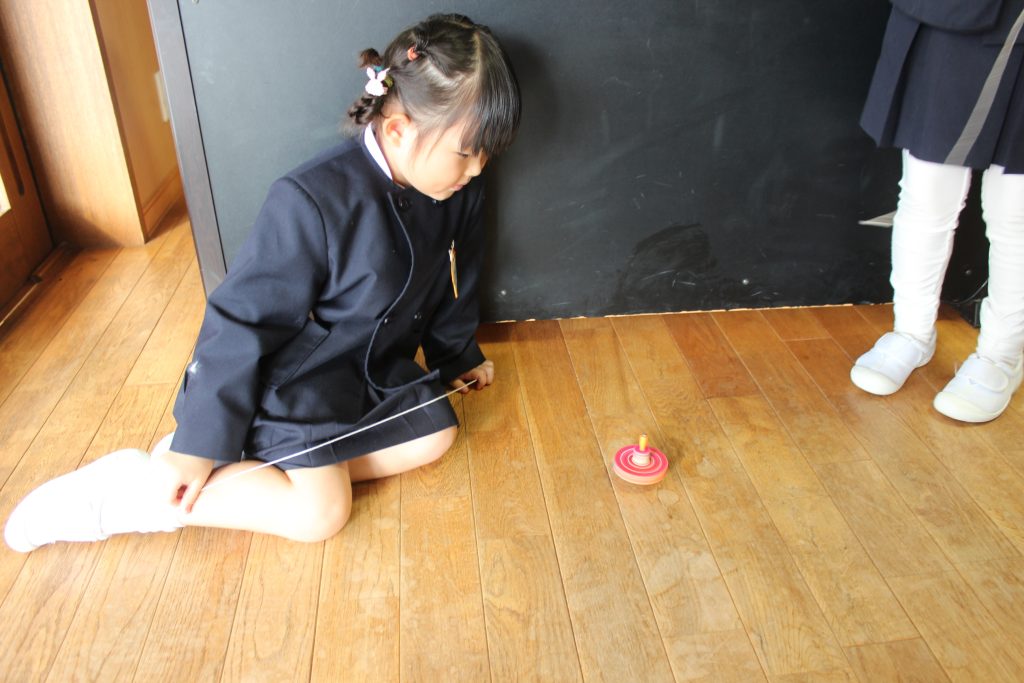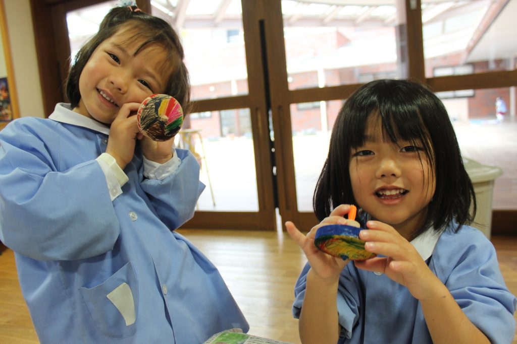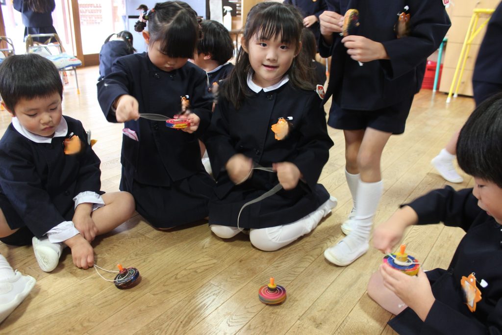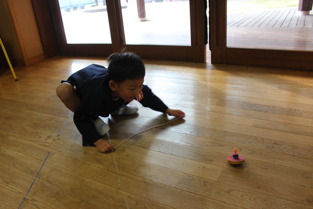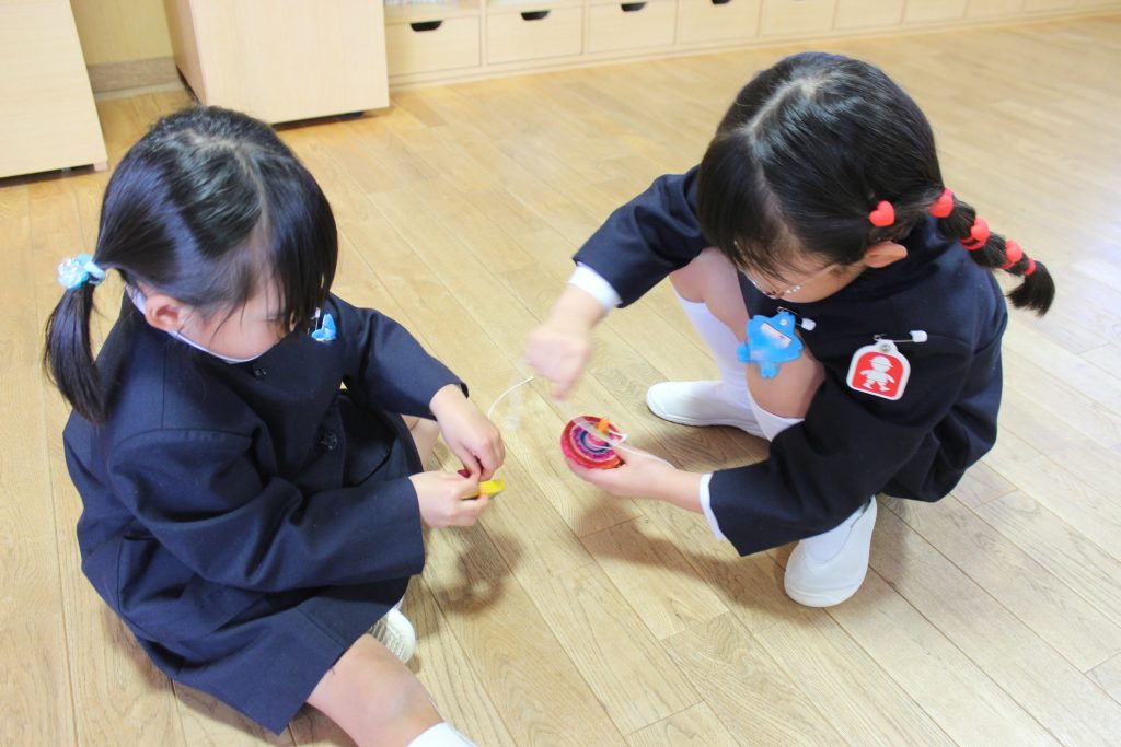 素敵な色が塗れたら早速回すことに挑戦!紐を巻く、紐を勢いよく引っ張る、と遊び方をみんなで確認してから行いました。初めは、なかなかコツを掴めず「難しい~」「全然回らへん😭」と話すお友達もいましたが、少しずつ回せるようになり「見て見て!回ったー!!」とニコニコの笑顔で見せてくれていました。冬休み前に持ち帰るので、それまではお部屋にこま名人さんがたくさん増えそうです😊💕