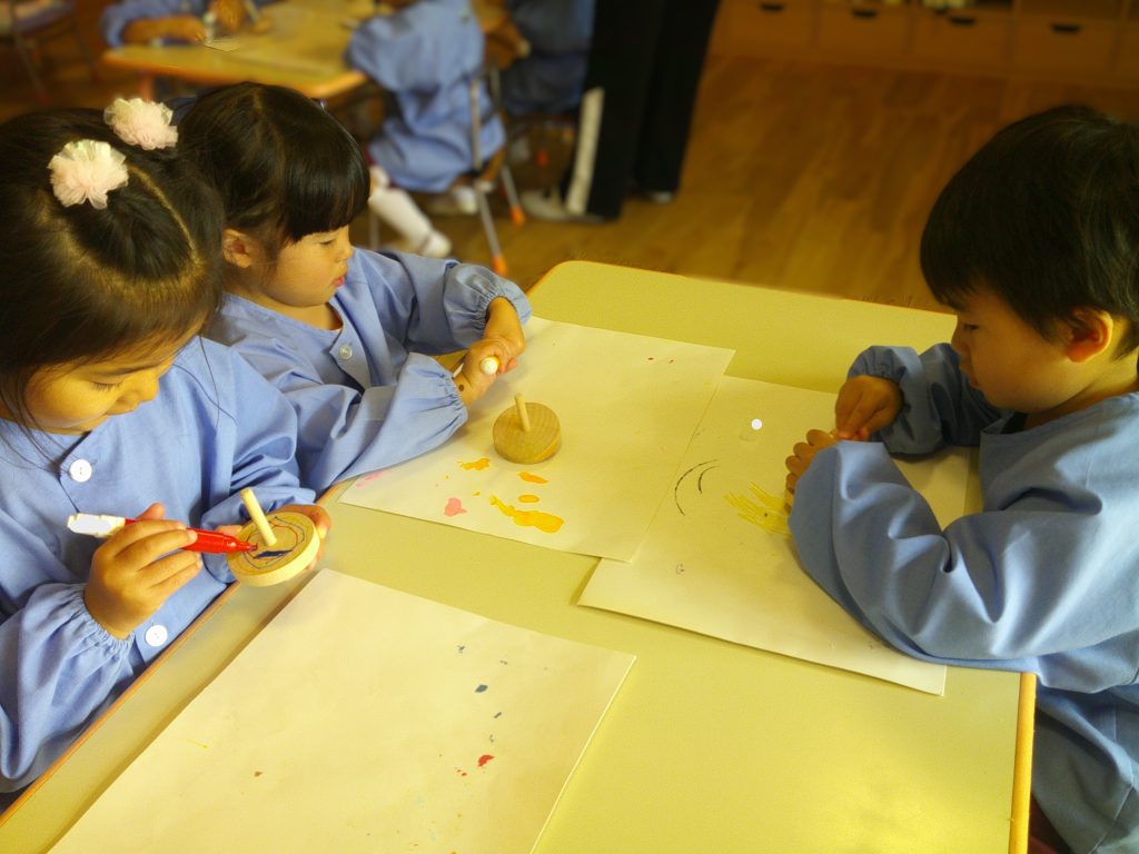 出来上がったこまを回してみると「回ると模様が変わった!」「先生、見て見てー!」ととっても嬉しそうに発見したことを教えてくれました😊