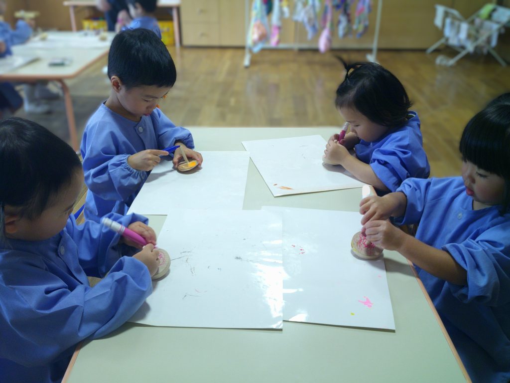 サインペンで好きな色を選んで、こまに色を塗っていきました。いろいろな色がある事をみんなでお話しながら「ピンクにしよう!」「全部の色使おう~」と楽しく色塗りをしていましたよ。