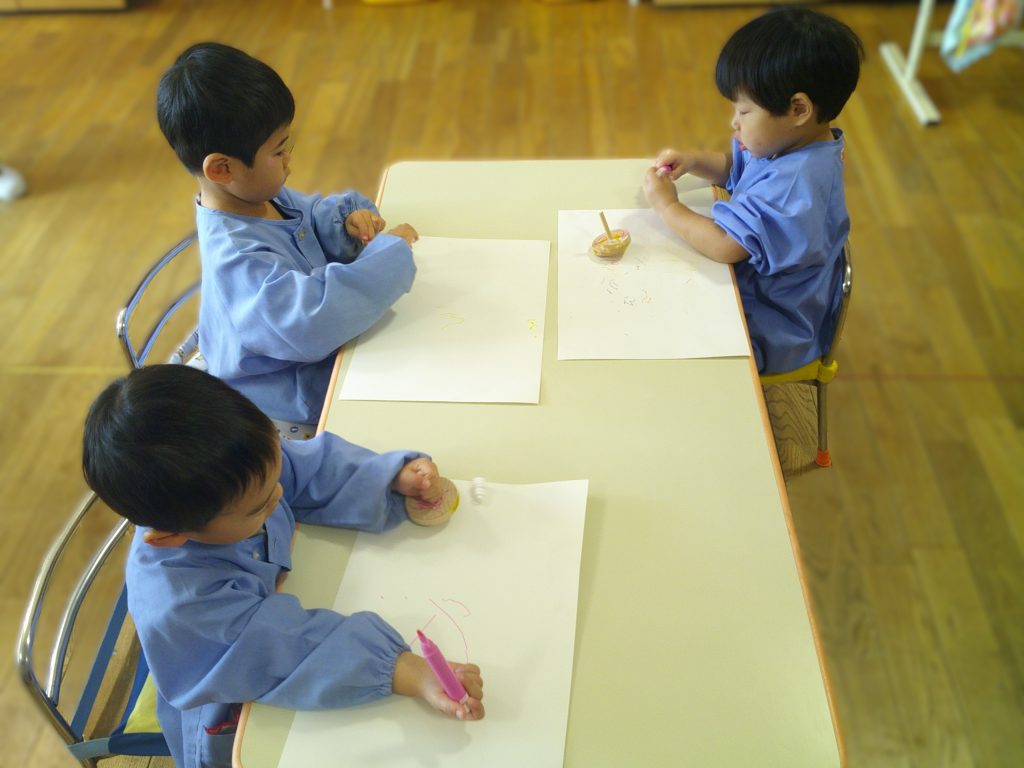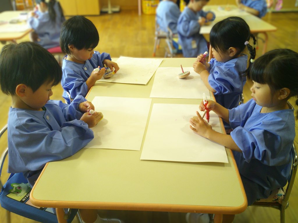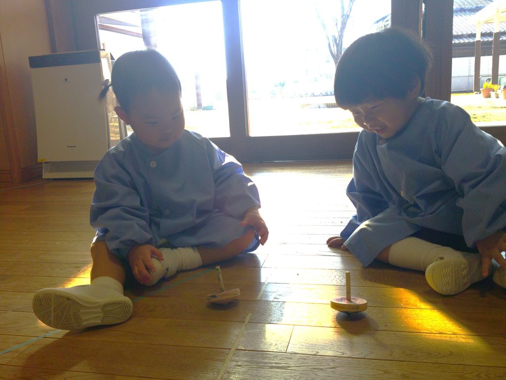 ひよこ・いちご組ではお正月遊びの一つとして、手の平をこすり合わせて回す「手回しごま」の制作を行いました。