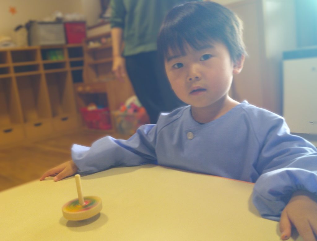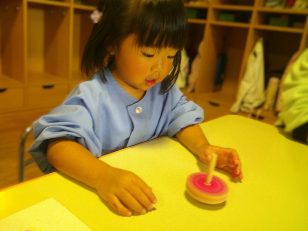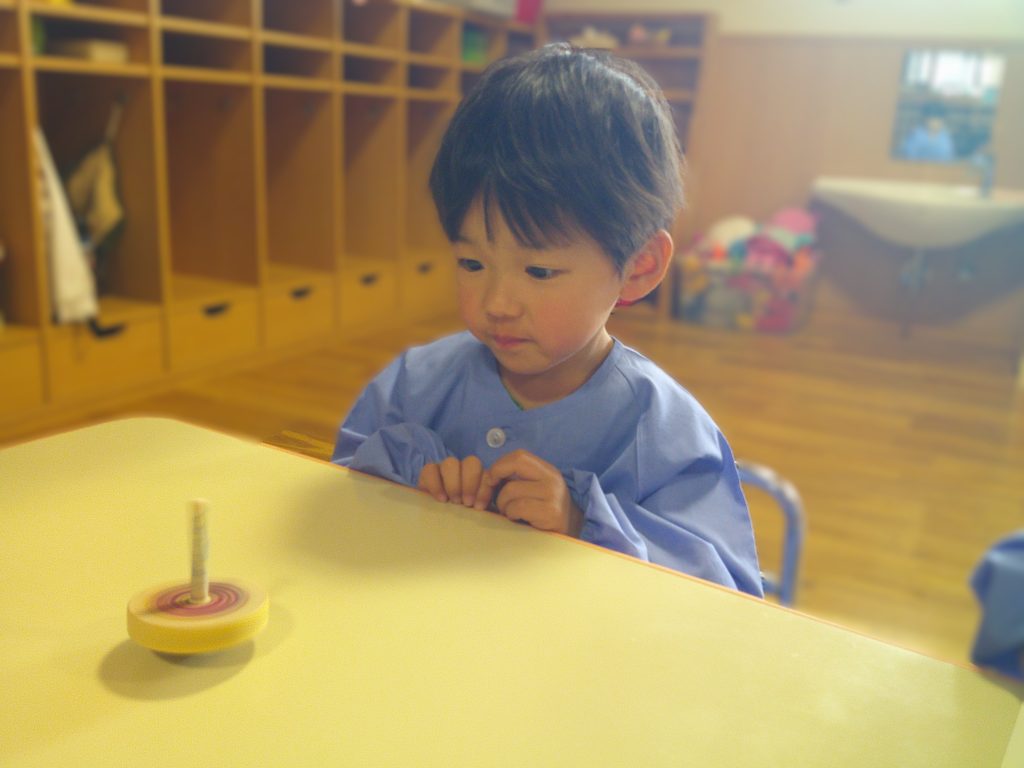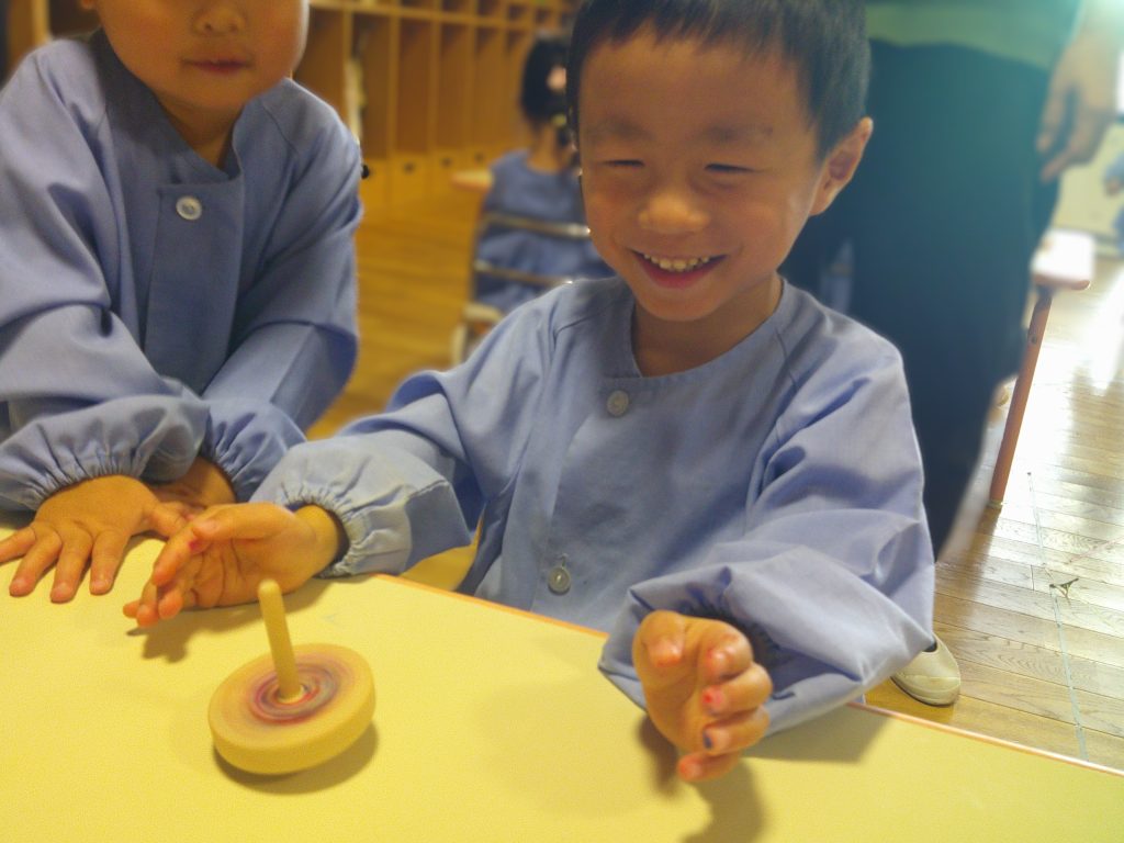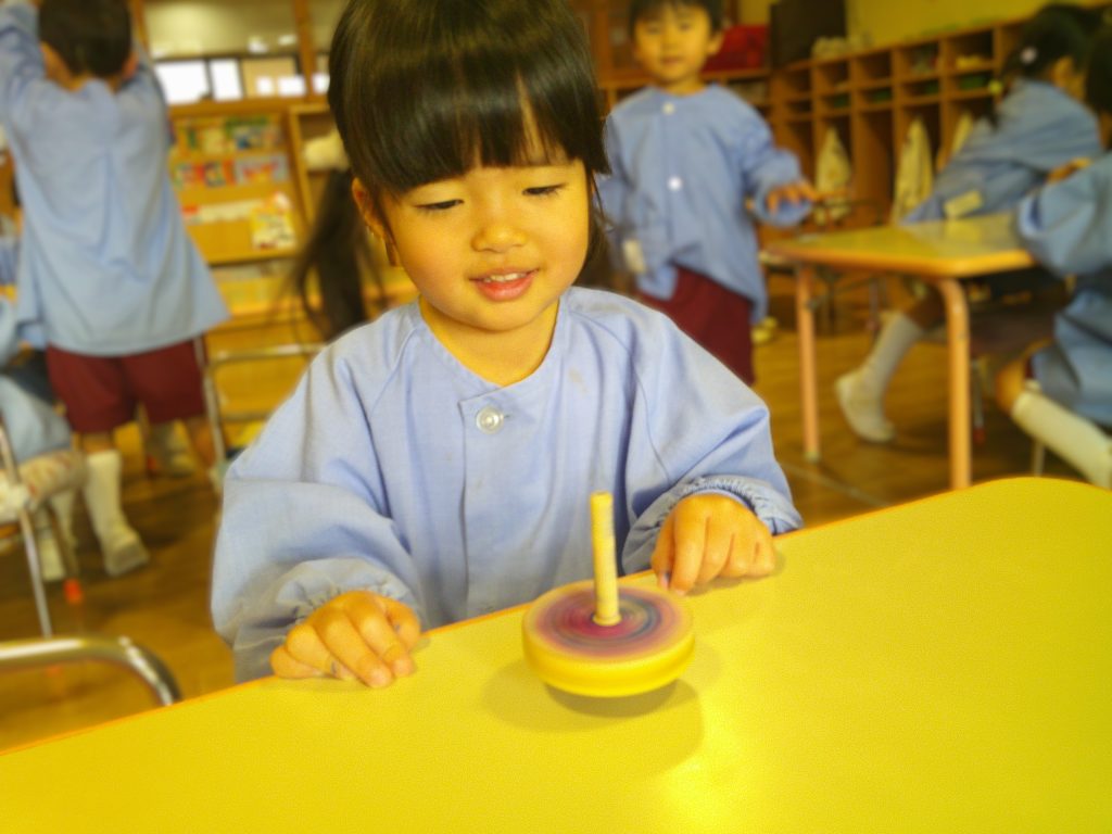 お友達と一緒に回したり「先生もやっていいよ♡」と楽しい遊びを共有したりして、遊びました。反対向きに回すことも出来る事を発見し「きのこみたいー!🍄」と大喜びでした。