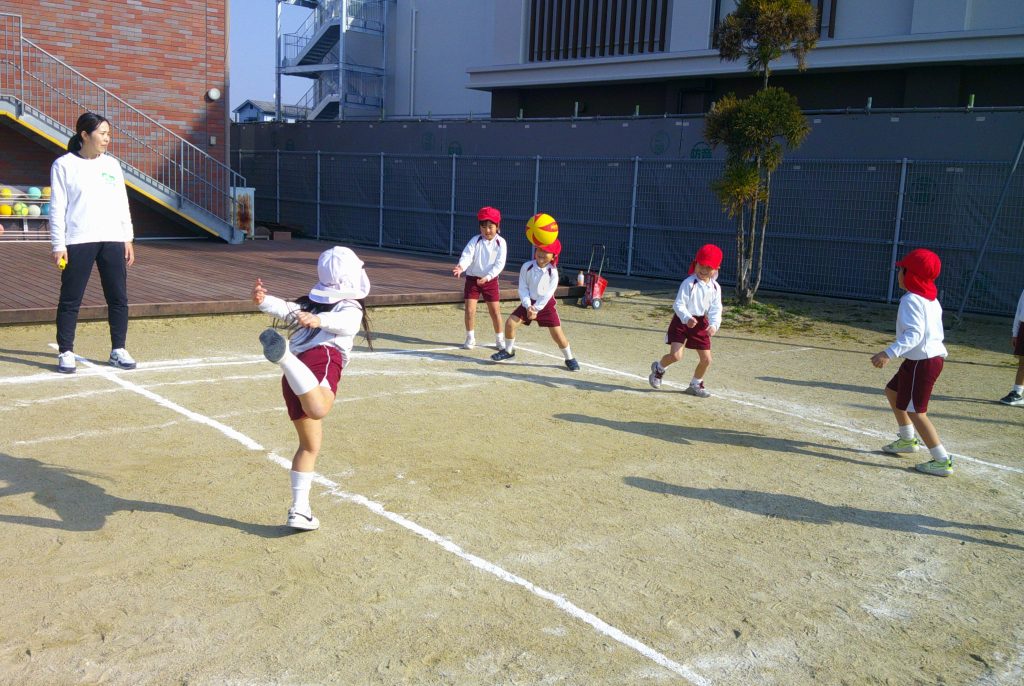 最後はみんなでドッジボールをしました!お友達を当てようと頑張っていました。