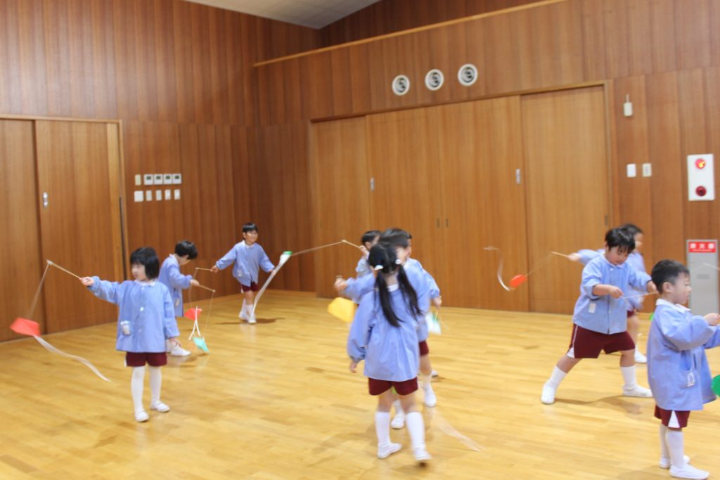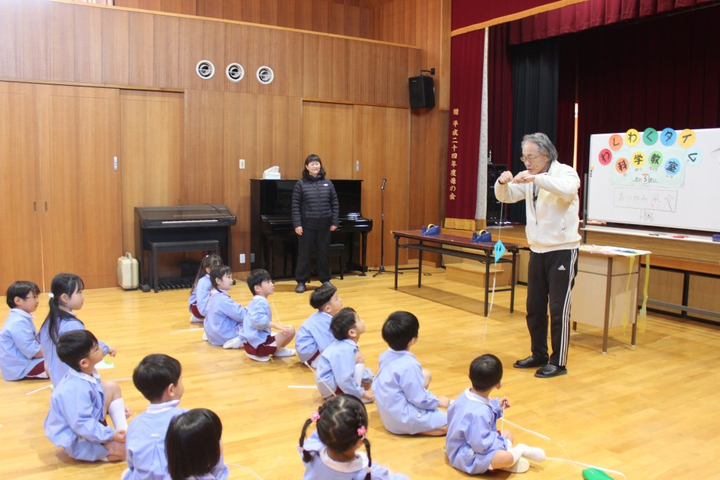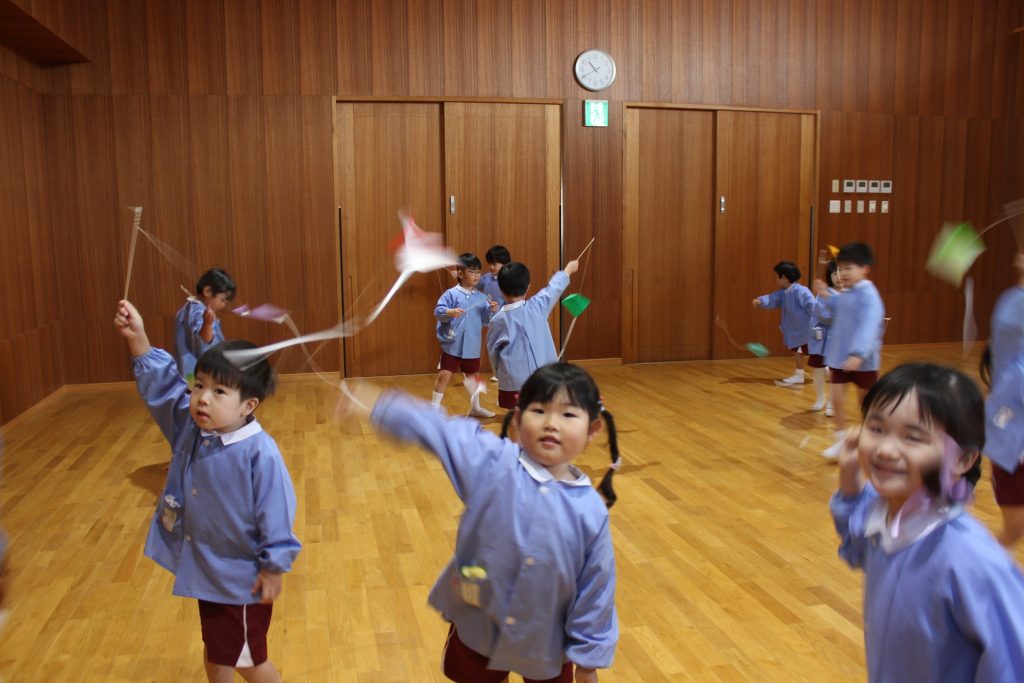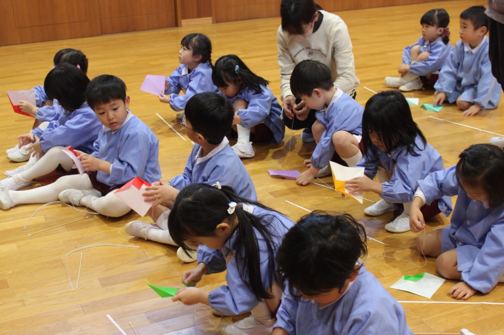 不思議な動きをするおりがみ凧に興味津々の子どもたち。理事長先生から作り方を教えてもらい、一生懸命に作っていました。一枚のおりがみからとっても素敵な凧が出来上がり、早速飛ばすことに挑戦!