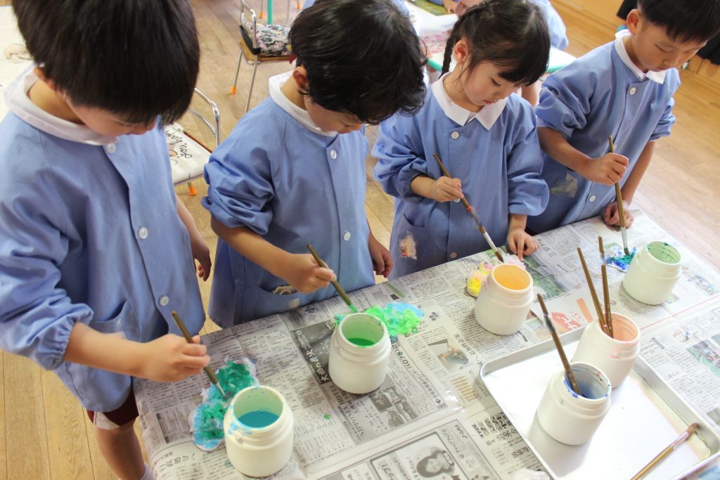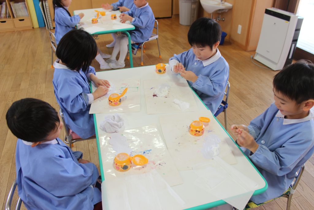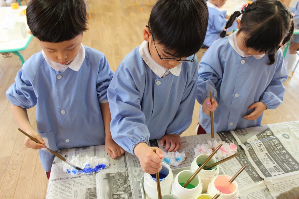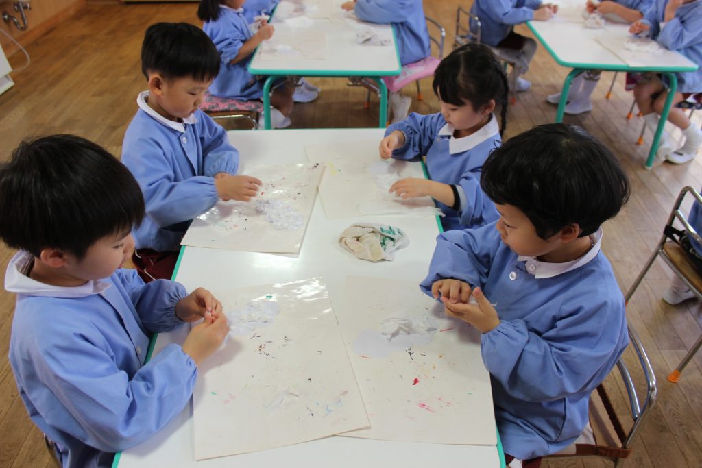 初めに、ティッシュをちぎって貼り、髪の毛を作りました。好きな色の絵の具でにじみ絵も楽しみ、素敵な髪の毛が完成しました。