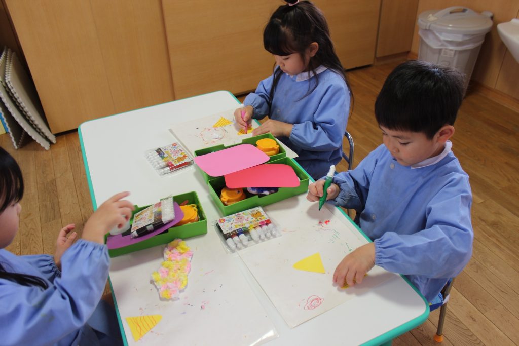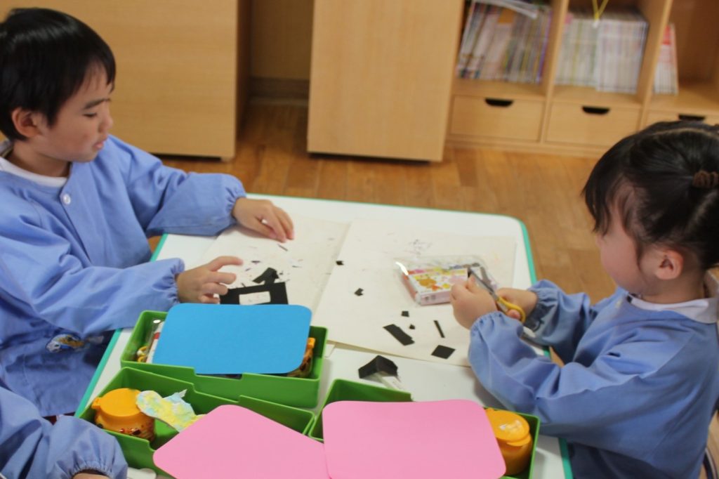 鬼の角は1本か2本好きな方を選び、模様もサインペンで描きました。そして、眉毛は自分たちで形を描き、線に沿ってはさみで切ることに挑戦しました!!「難しい~😖」と苦戦しながらも個性溢れる素敵な眉毛が完成しました。