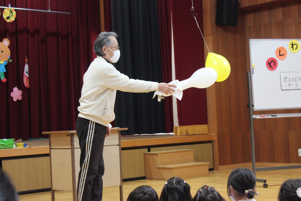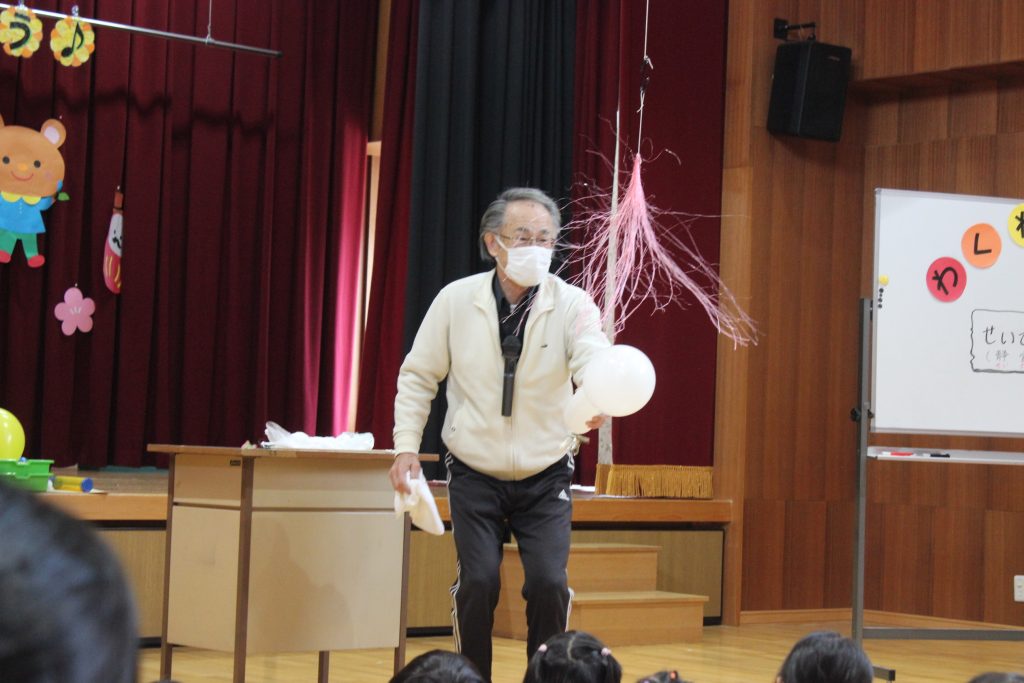 静電気で、風船がくっついたり、離れたりして不思議そうな子どもたち、風船が理事長先生の服や顔にくっつくと、子どもたちは大盛り上がりでした。とても楽しいひとときでした。。