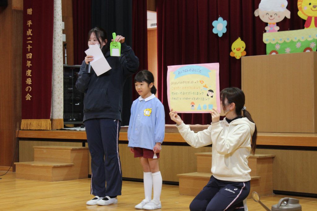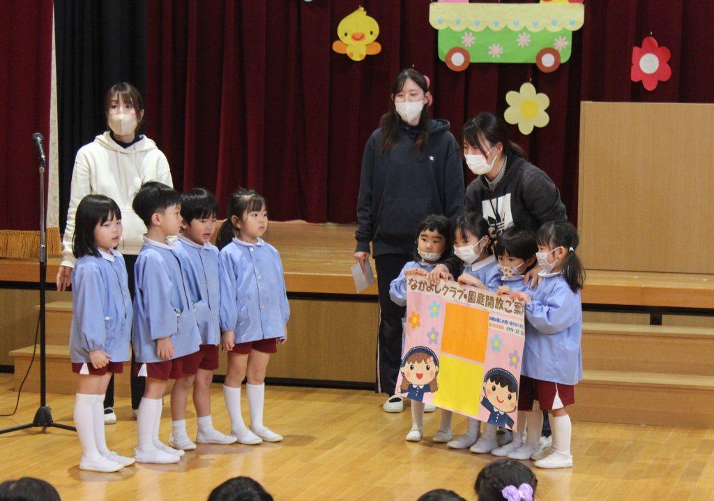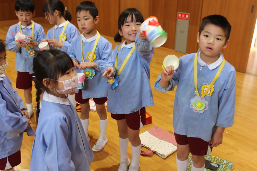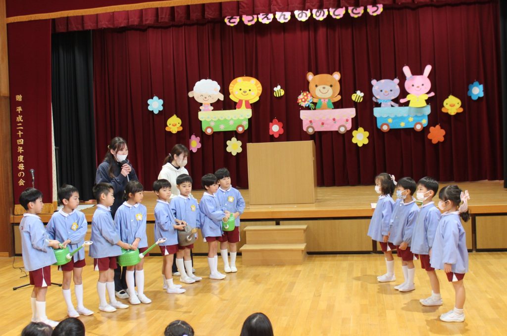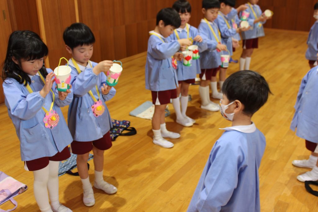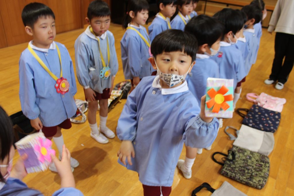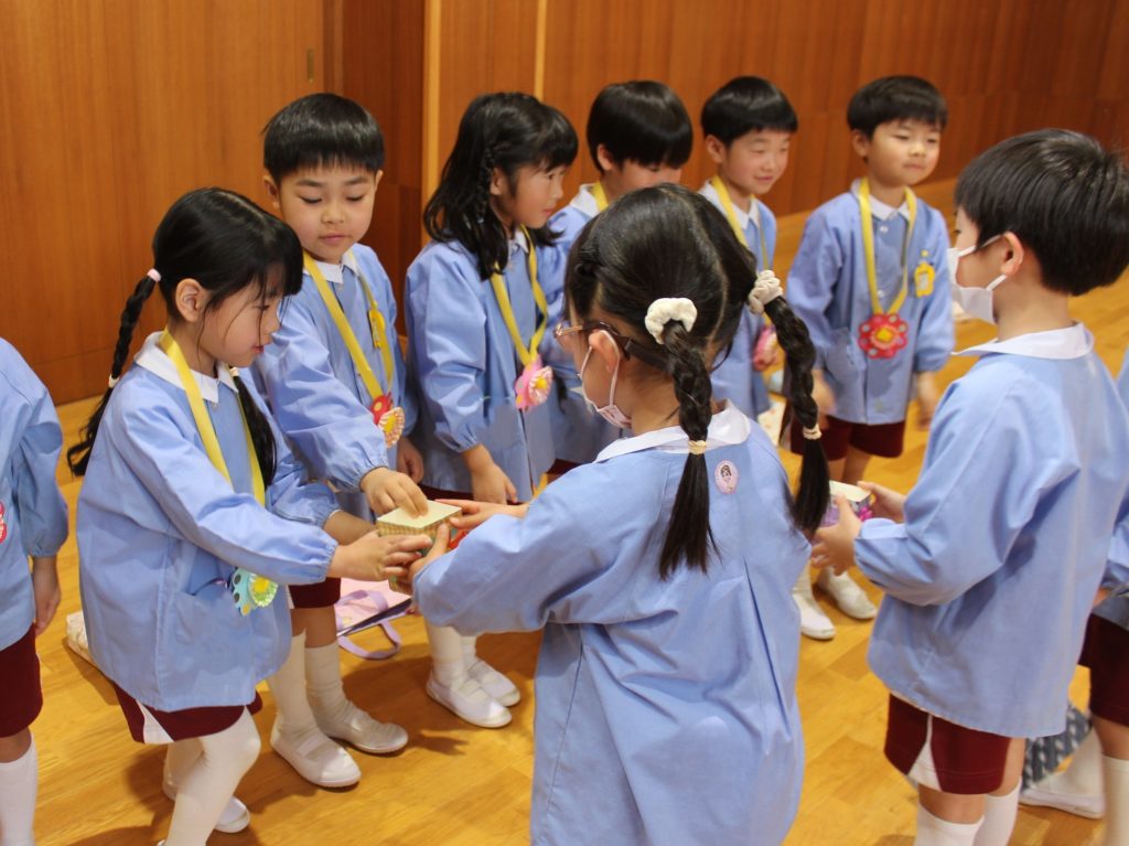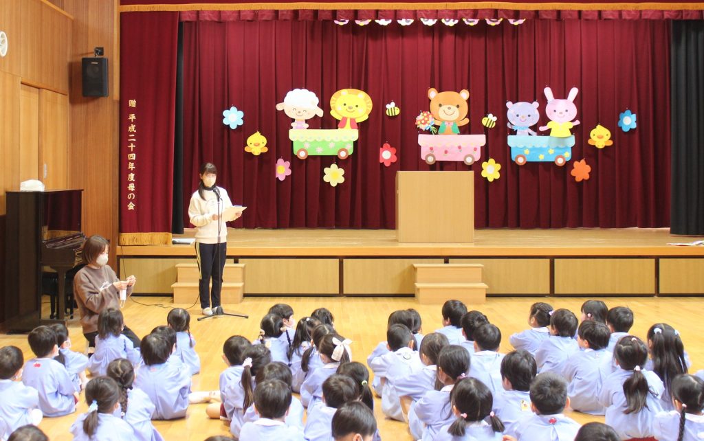 もうすぐ卒園する年長組さんとのお別れ会を行いました。園長先生のお話を聞いて、これまでの年長組さんの頑張りや思い出を振り返り、ありがとうの気持ちでいっぱいになったみんなです。
