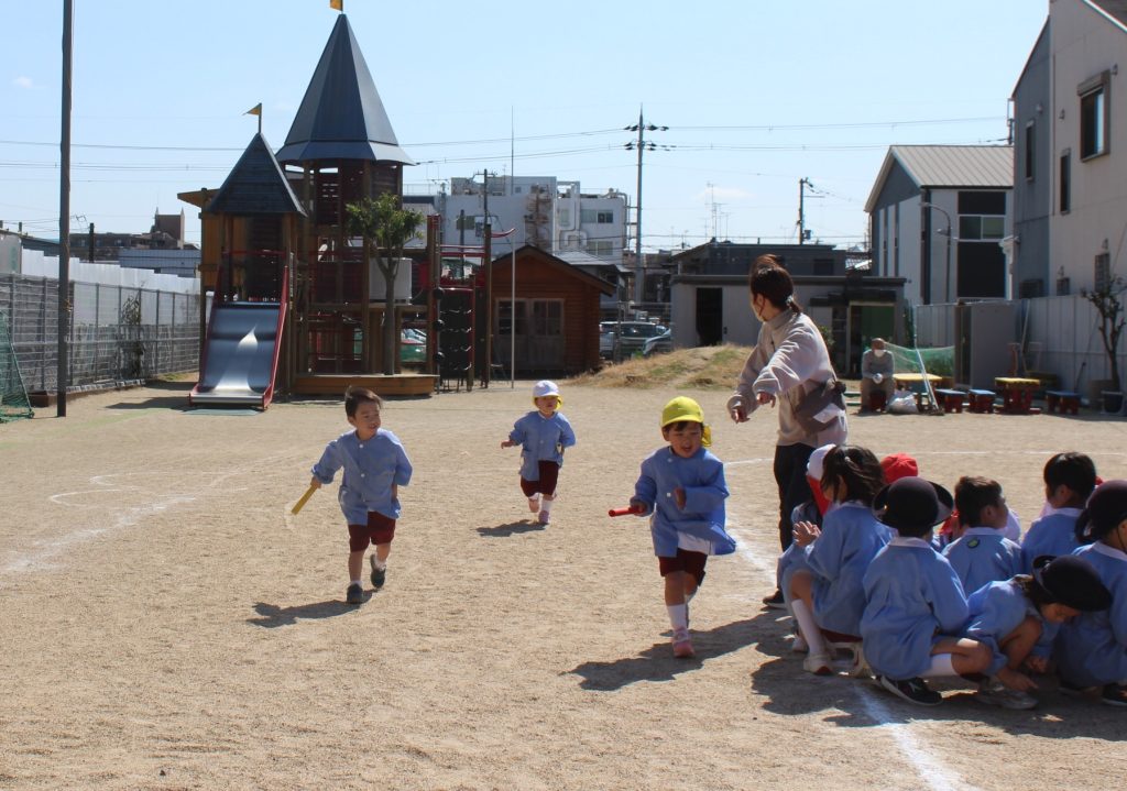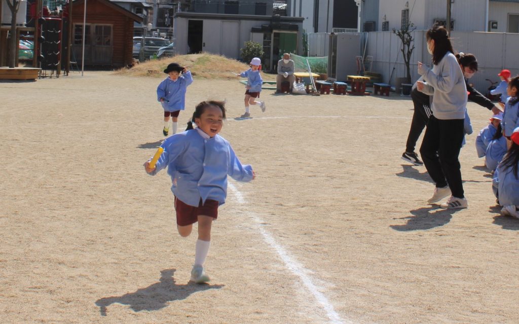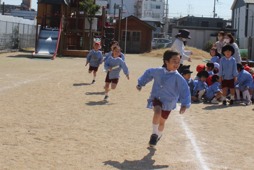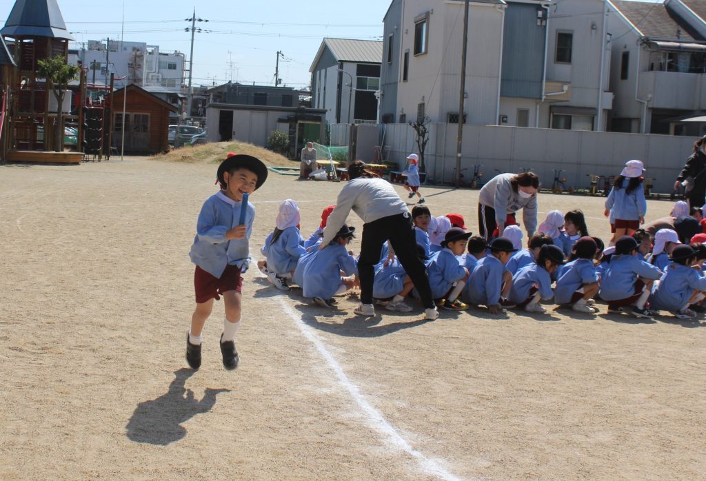 午後からは、園庭で全学年を4チームに分けてリレーをしました。ひよこ組さんから、年長組さんまでみんな一生懸命に走り、応援にも力が入りました!